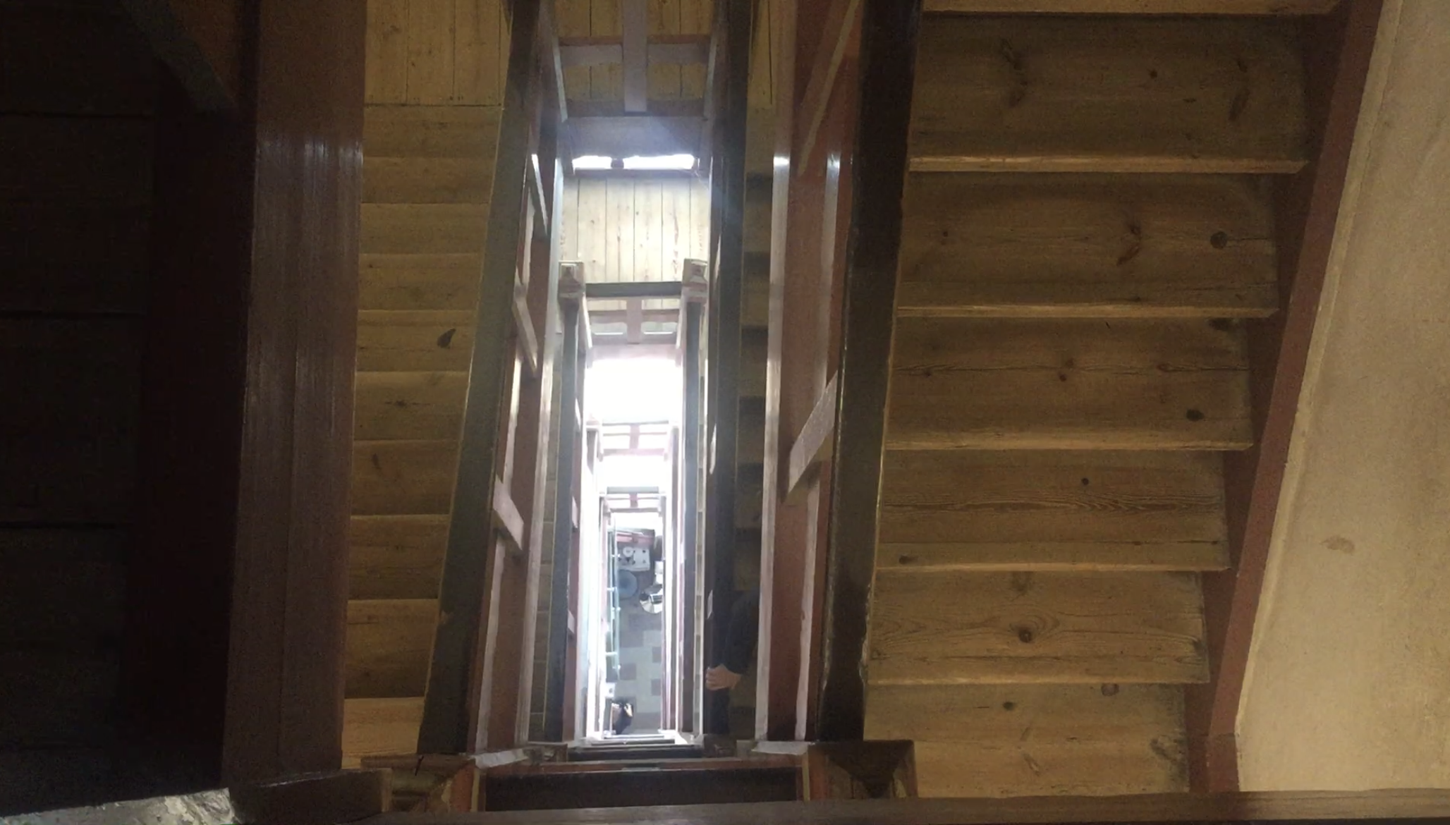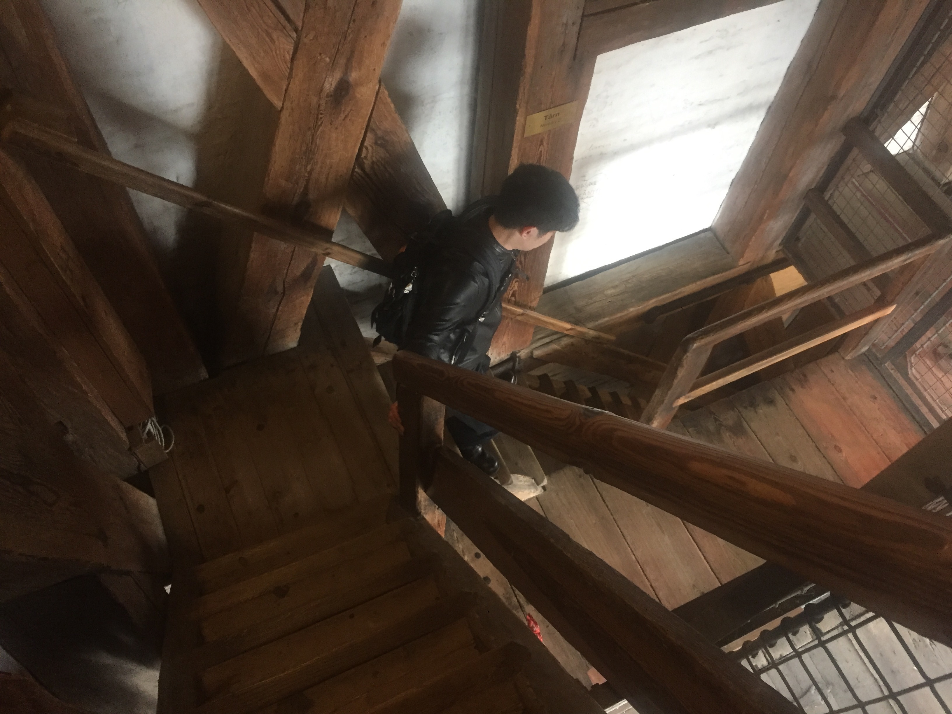 還有150級才到塔尖,而這裡的梯級不是室內那種木造梯級而是金屬的,雖然沒有下雨但還是有點滑。而且當天超級大風,強得令人站不穩,往上走要用力抓住欄杆邊用腳走邊用手扯自己上去。走上去時遇到其他遊客往下走,也是緊緊捉住欄杆,經過對方時唯有貼著牆站穩以免被風吹倒。