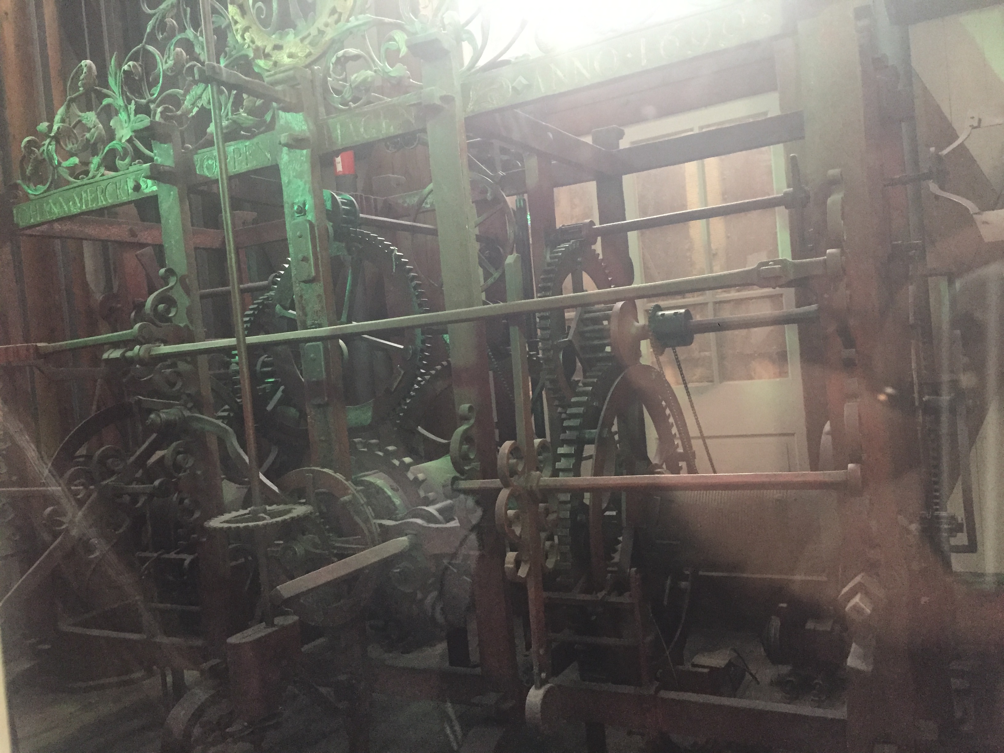 再往上走就開始看見一些齒輪和機械部分,因為這個教堂擁有全北歐最大的鐘琴。這個鐘琴有48個銅鐘,最大的鐘重達二千公斤,最小的也有十公斤,整個鐘琴接近十二噸重,每天早上八時至午夜每到正點就會響起不同音樂,這些齒輪便是鐘琴的部件。
