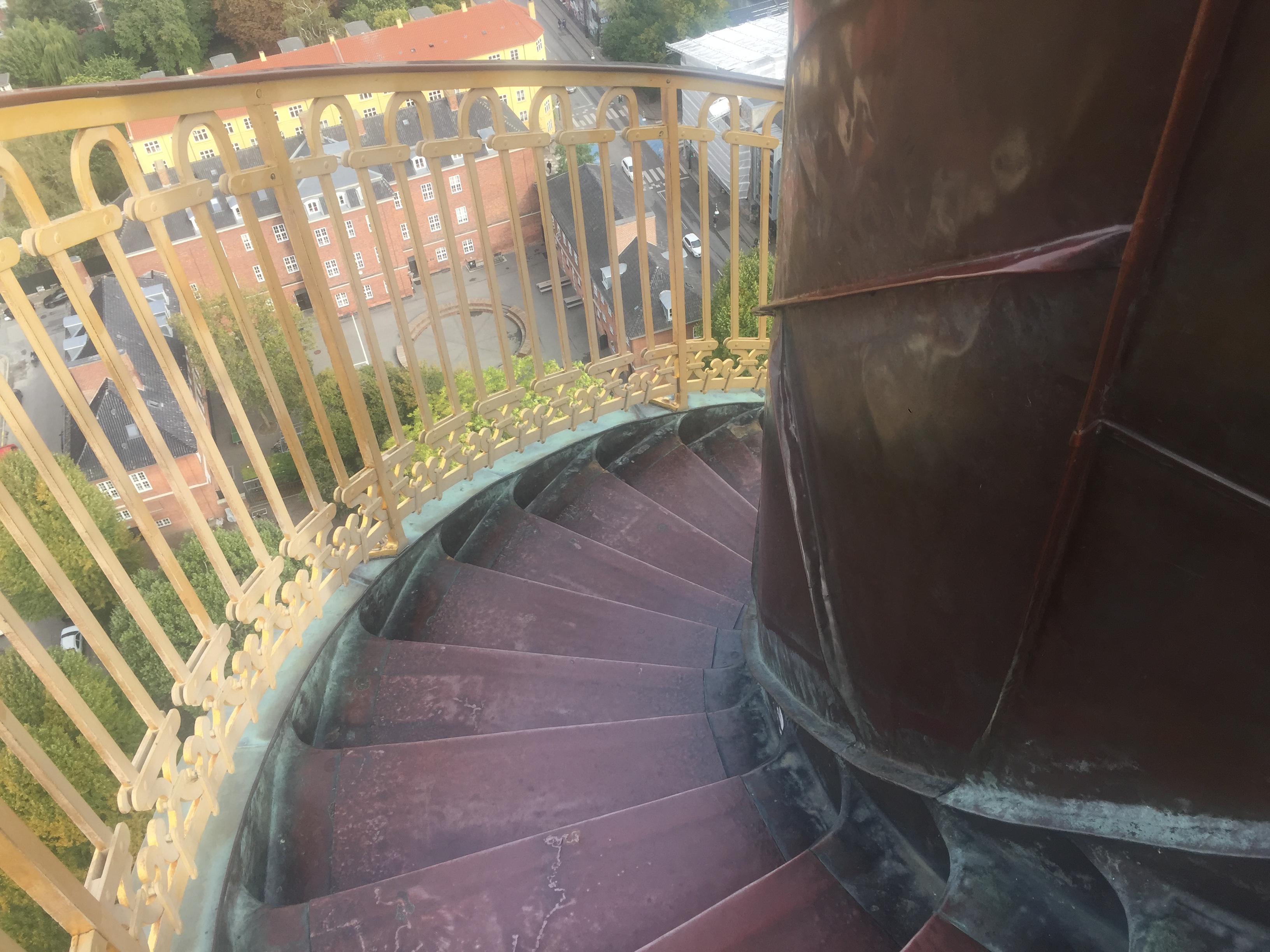 樓梯越行越窄(因為塔越來越幼),也越來越大風,幾經辛苦終於走到樓梯的盡頭到達塔尖!原來到達塔頂就會在那金球下,是沒辦法看到塔尖上的基督像的。因為太大風,我只能在最頂一級樓梯坐下看一會兒風景。風景實在非常漂亮,因為這裡應該是我在哥本哈根到過最高的地方,但看下去十分可怕。坐了一會我便往下走回去,往下走比往上走感覺再驚險一點,因為不能夠不往下望!