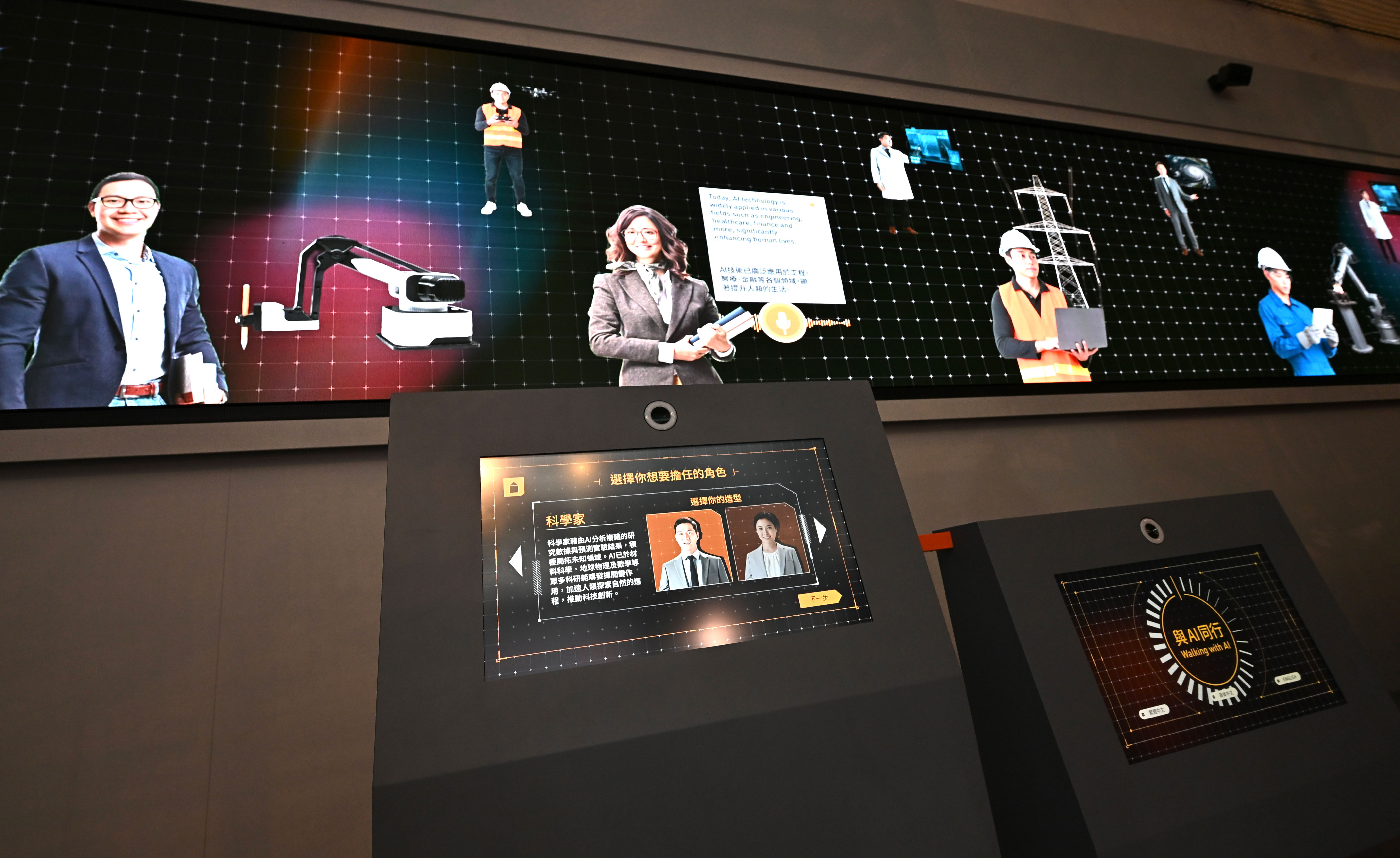 「人工智能廳」讓參觀者認識人工智能的基本原理,並展現人工智能與創意藝術及中國文化的融合,以及在醫療與生命科學領域的應用。部分展品精選自二○二四年「盛世啟航—新中國成立75周年成就」展覽系列的「智慧時代」展覽,有見相關展品甚受觀衆歡迎,故科學館將展品進一步提升並結合全新展示後移師至新展廳內展出。展廳內超過九成展品為互動展品,參觀者可體驗人工智能在繪畫、作曲、對奕、猜拳等不同的應用,帶來充滿趣味的探索體驗。