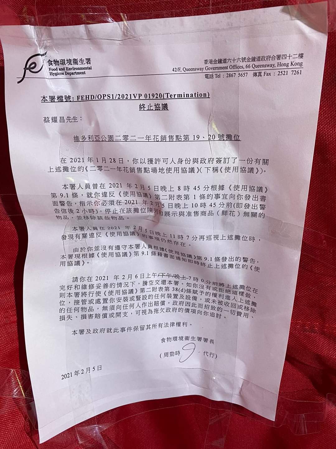 年宵花市今日(2月6日)開鑼,每年都在維園擺檔的支聯會表示,被食環署終止合約,要求今早7時前搬走物資。