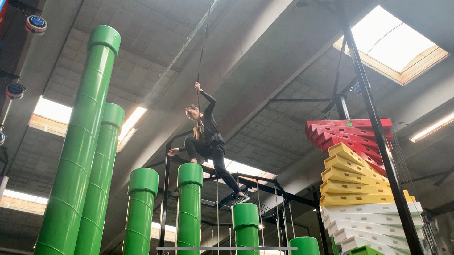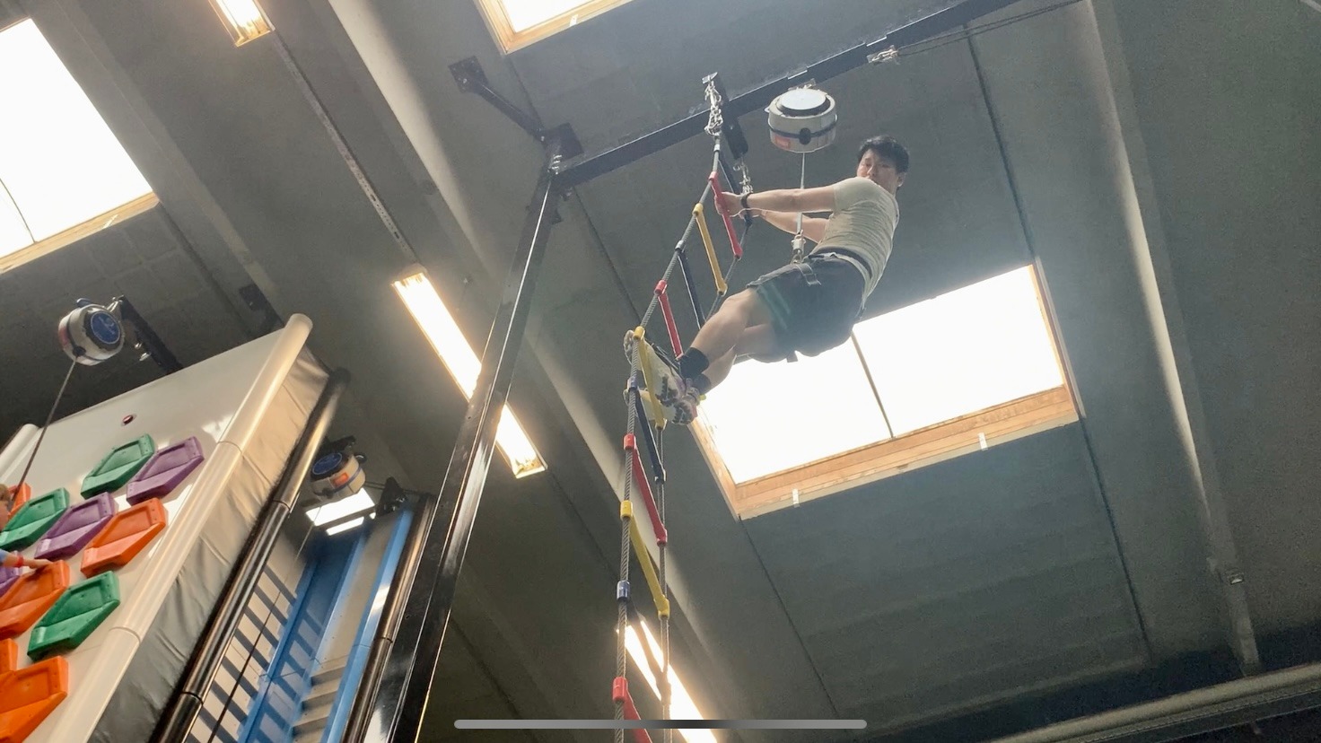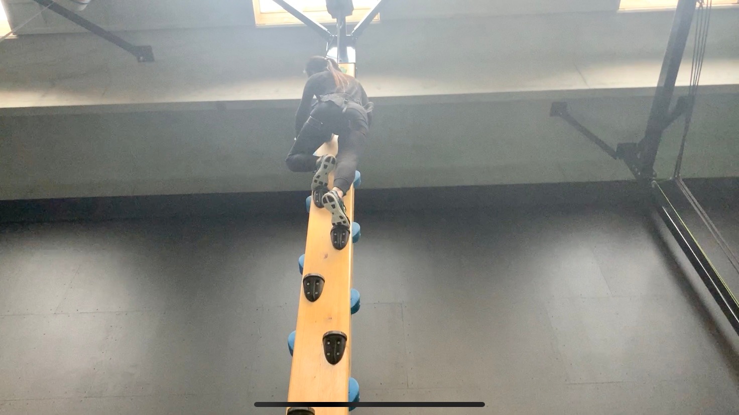 這條路線是一堆越來越高的柱子,一級一級走上最高的柱子,難道不高但比想像中難平衡。另外在右邊一條條疊起的那條路線,一邊的把手是正常可以正手抓住的,能輕鬆上頂,另一邊的把手則是向下的,我完全理解不到怎樣爬所以失敗了。