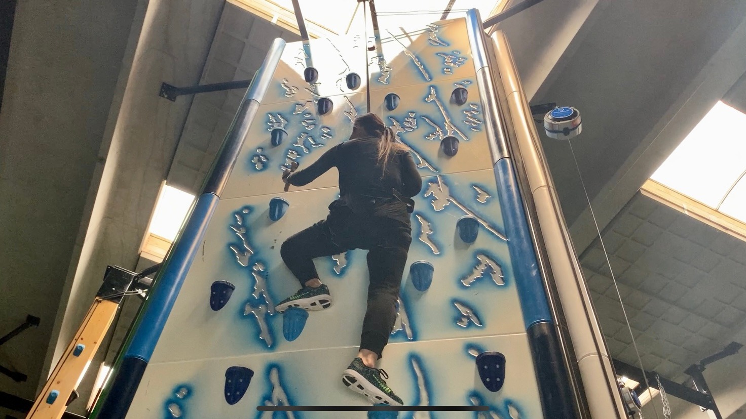 換好運動鞋後,我們便到攀登場門口等待穿上裝備。因為我們不懂丹麥語,便獲派一個員工專門為我們穿上裝備和講解。裝備上有個扣可扣上每條路線的安全繩,扣上後便可以開始攀登,當攀上頂或沒辦法繼續往上爬時,只需鬆手,身體向後靠,安全繩便會慢慢將你降至地面,這時候便能解開安全扣再去玩另一條路線。職員示範一次後,要我們做一次表示我們學好了便可以自由活動。