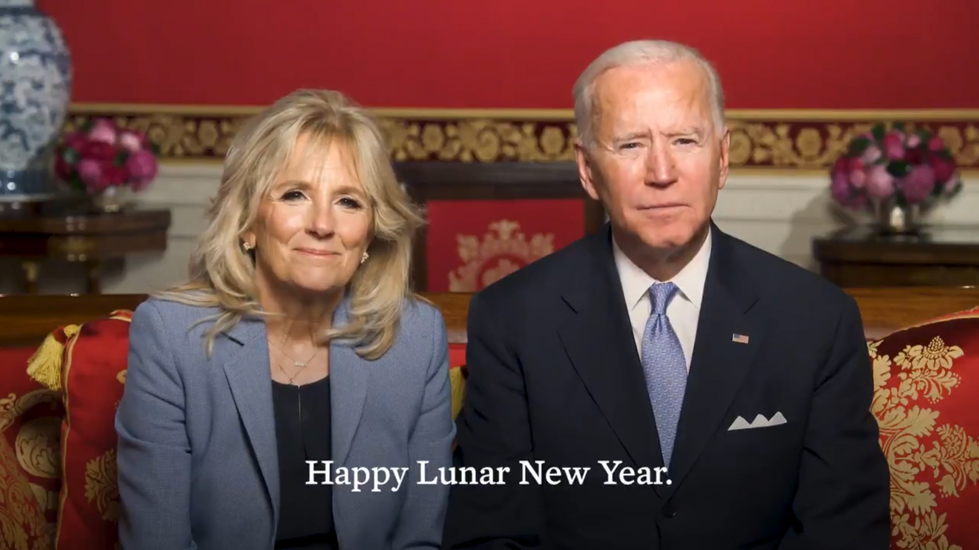 美國總統拜登與第一夫人吉爾拍攝賀年片段,祝賀牛年快樂。