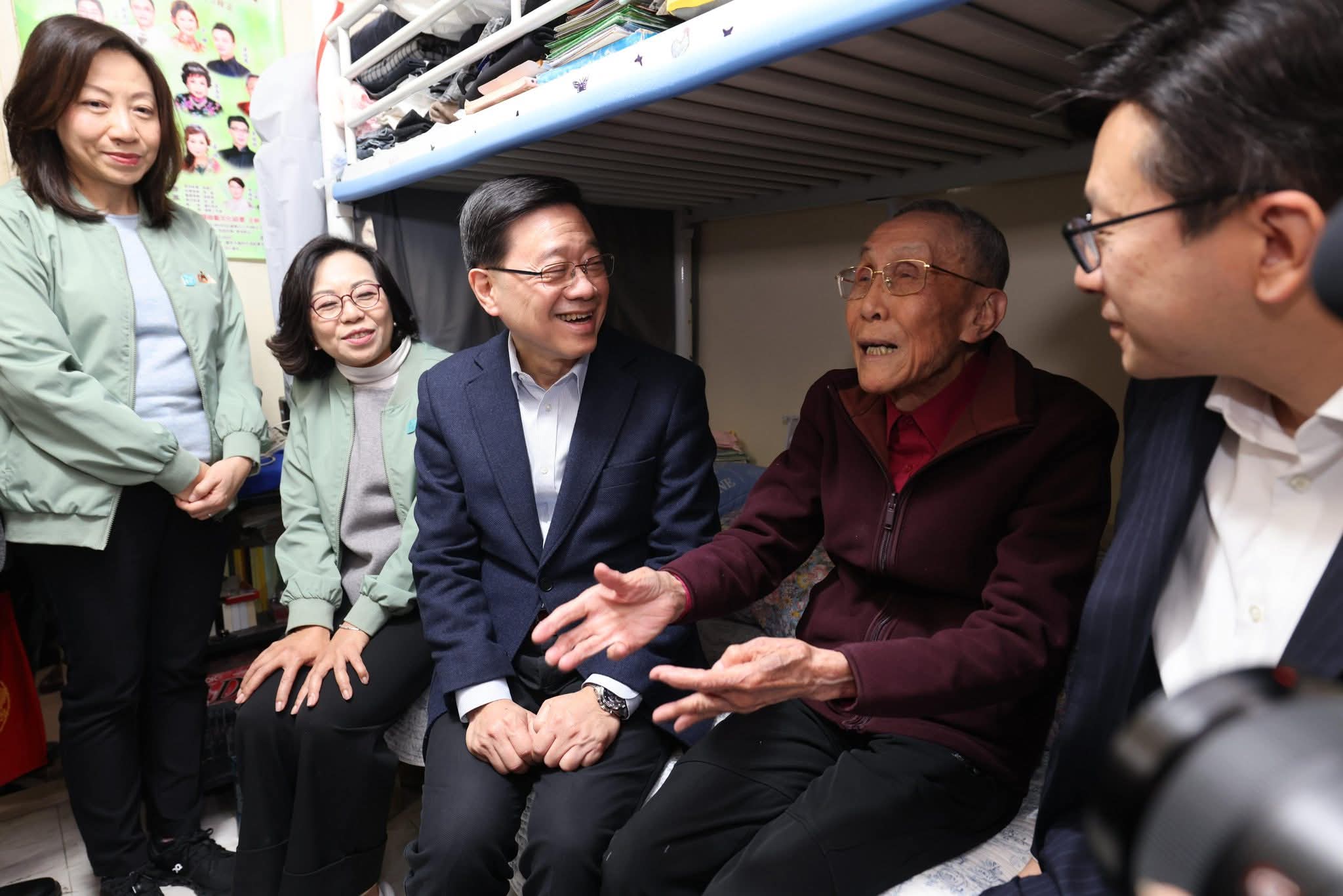 特首李家超今日(2月13日)率領民政及青年事務局局長麥美娟、勞工及福利局局長孫玉菡、民政事務總署署長杜潔麗及油尖旺民政事務專員李家維落區,在油麻地駿發花園分別探訪了一名獨居長者和一個雙老家庭, 又參觀了屋苑內的長者地區中心,與一群長者齊高歌、玩遊戲,同慶新歲。