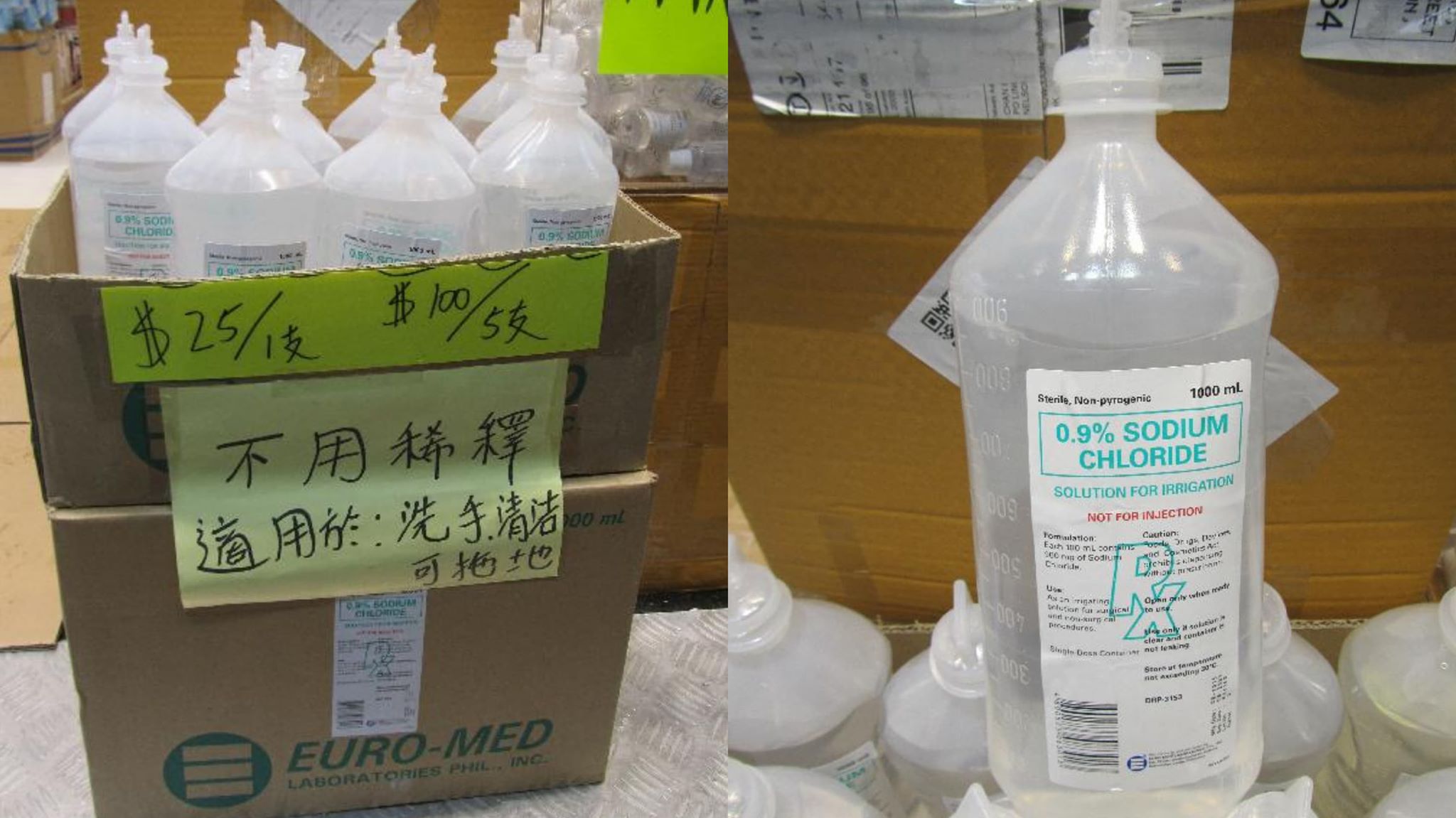 海關早前發現旺角區內有藥房懷疑以不良營商手法售賣生理鹽水,於是部署「放蛇」行動,並派員到不同藥房進行試購。期間發現上述涉案藥房出售以塑膠樽裝容器盛載標示為「0.9% sodium chloride」(氯化鈉)及「清洗傷口用」的生理鹽水,每樽1000毫升售價25元,5樽100元;而載貨紙箱上則展示自製單張,聲稱生理鹽水適用於清潔雙手和地板,與產品說明不符,涉嫌違反《商品說明條例》。