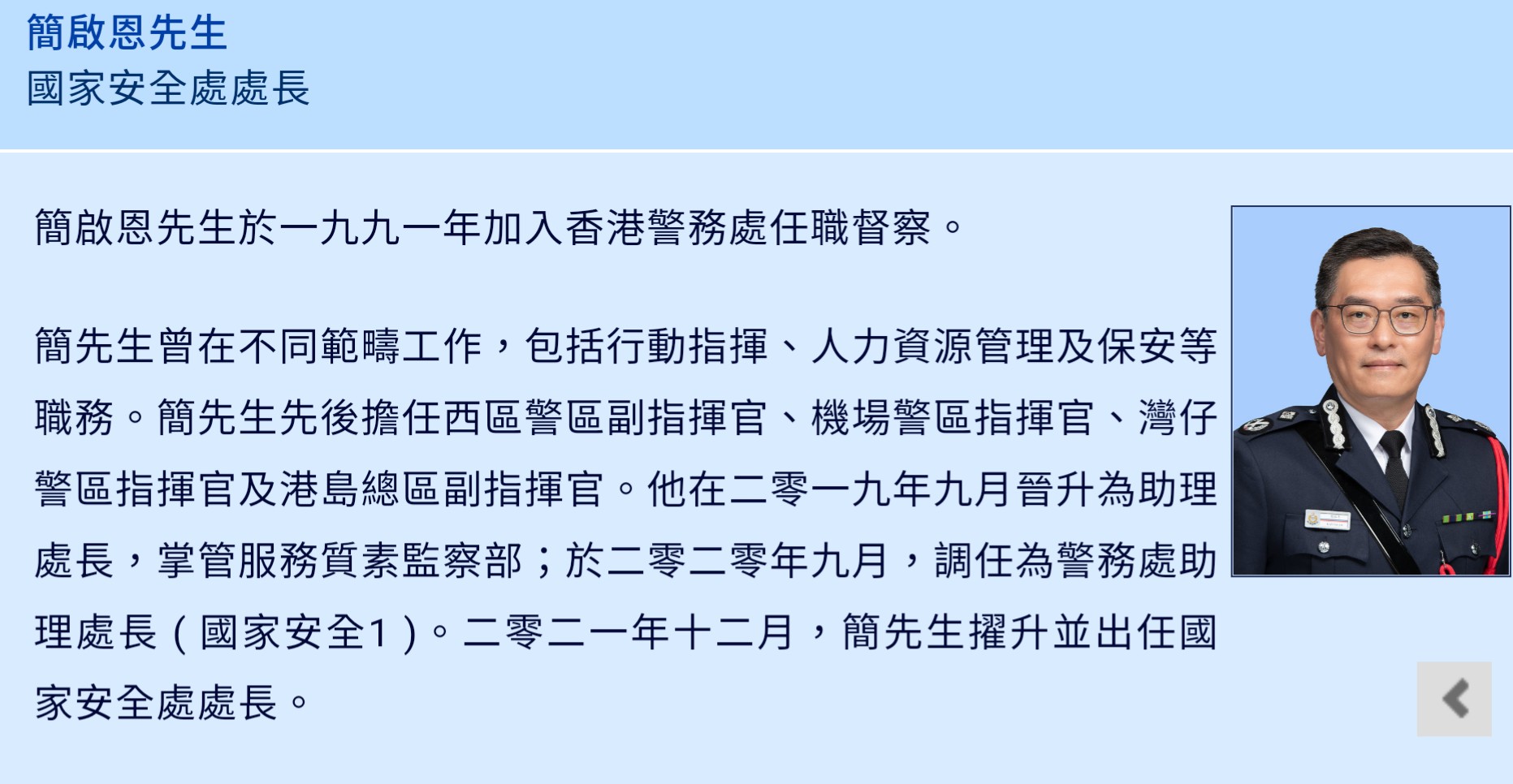 根據警務處網頁題示,警務處助理處長簡啟恩已接替蔡展鵬,升任國家安全處處長。