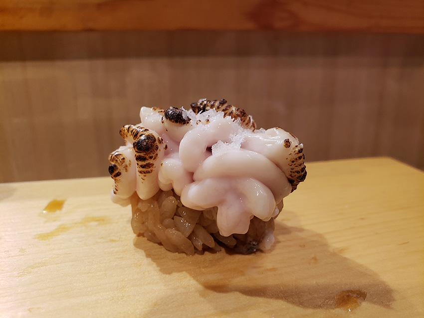 這店對米飯的處理亦值得一讚。記得壽司之神小野二郎曾分享過,一件出色的壽司,米飯比魚介更為重要。用微暖的飯,壽司才會出色。而這店於盛載米飯的木桶內置以暖水袋,保持米粒的温度。同時,師傅握飯的力度亦恰到好處,不會黏作一團。許是遊客都蜂擁至豊州之關係,築地人流明顯減少,計及地點與輪候時間,這店絕對比那些豊州「名店」更吸引。