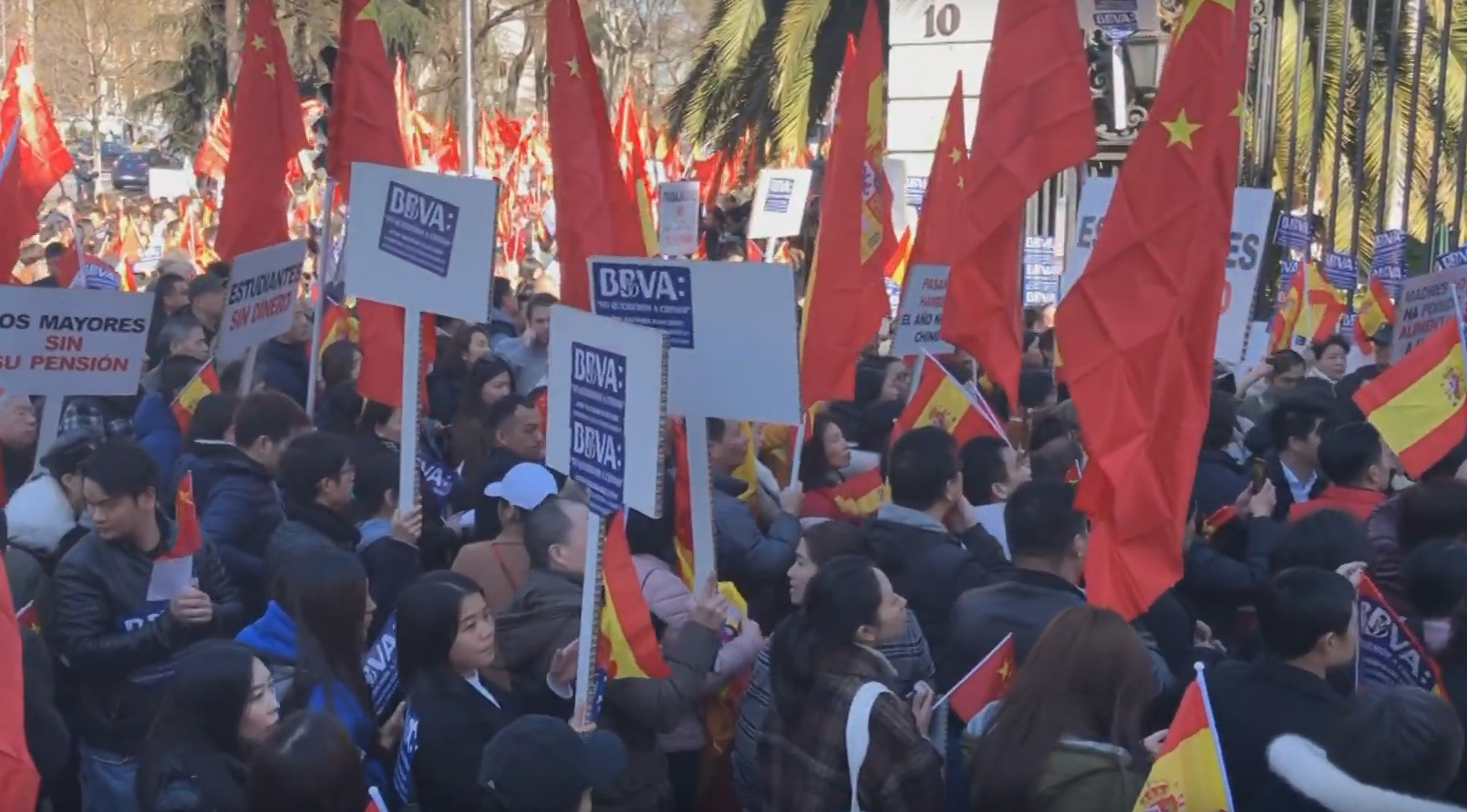 上星期五的示威行動中,有參與者高舉五星旗及西班牙國旗,以及備有反歧視標語,要求BBVA解封帳戶,期間有示威者高唱中國國歌。