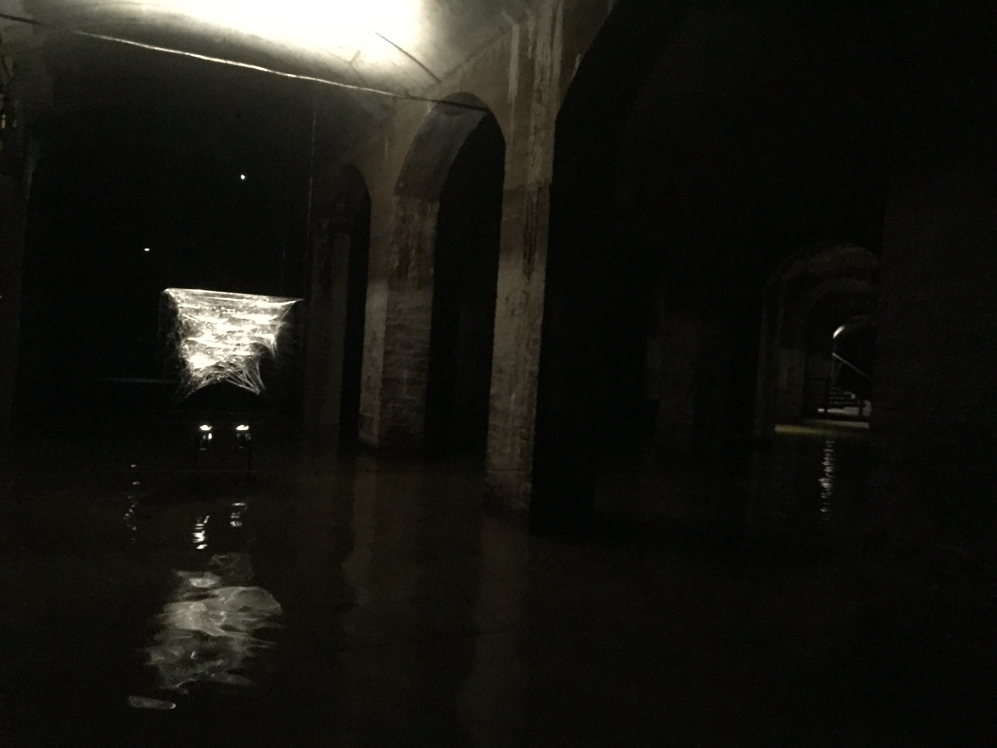 我們到訪時的展覽是Tomas Saraceno的Event Horizon,場地只有微弱的燈光。職員告訴了我們路線後(就是穿過水塘的幾個「大廳」再回到起點)便讓我們坐上小船給我們自己划了。