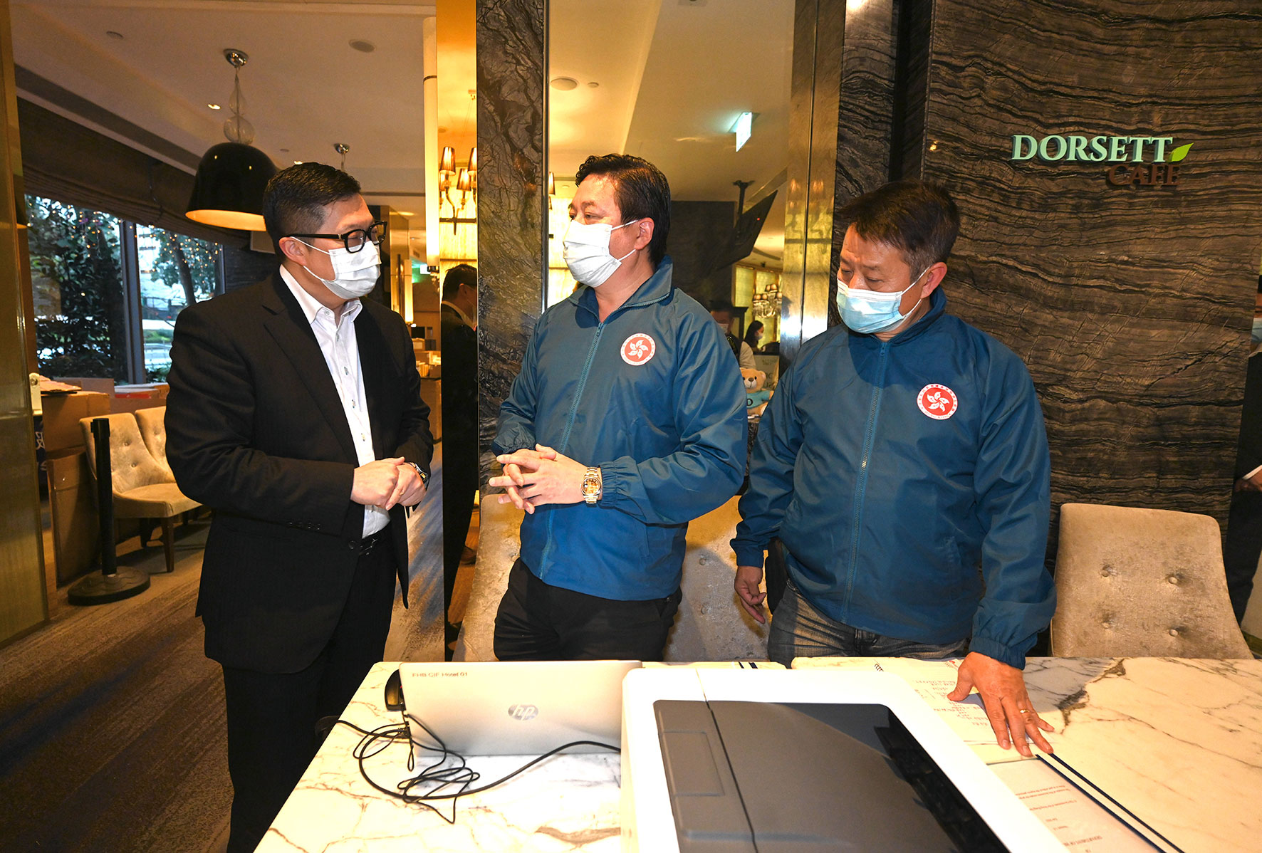 保安局局長鄧炳強今日(2月17日)下午到荃灣帝盛酒店視察,確保首間轉為社區隔離設施的酒店準備就緒。