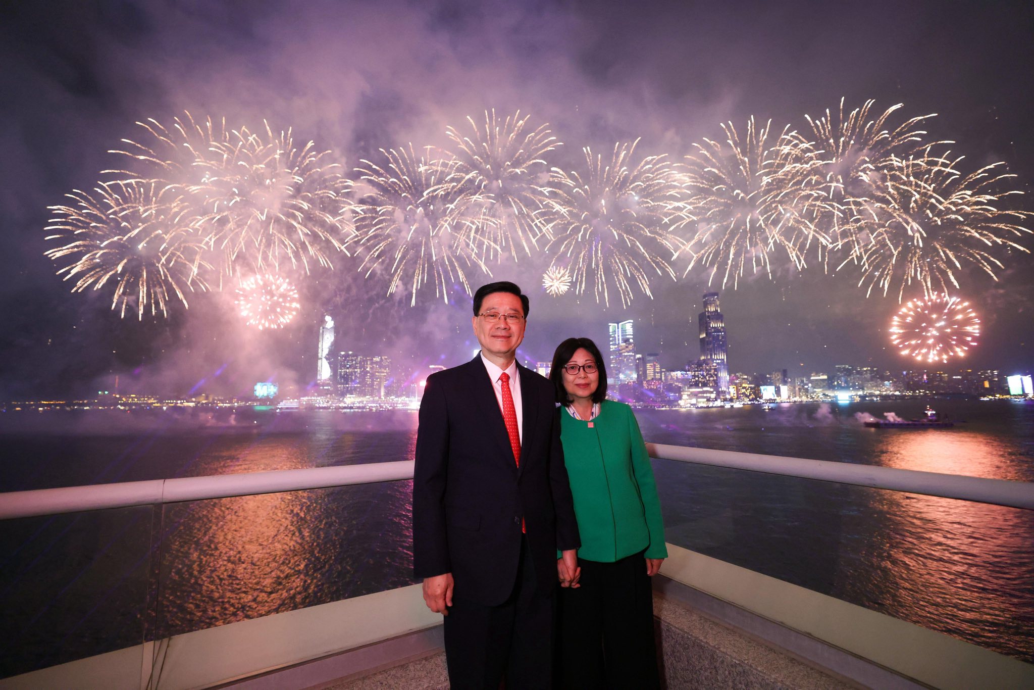 今日(2月18日)是大年初二,晚上特首李家超和太太李林麗嬋到灣仔觀賞馬年煙花匯演,與維港兩岸數以十萬市民和遊客一起共慶新春。