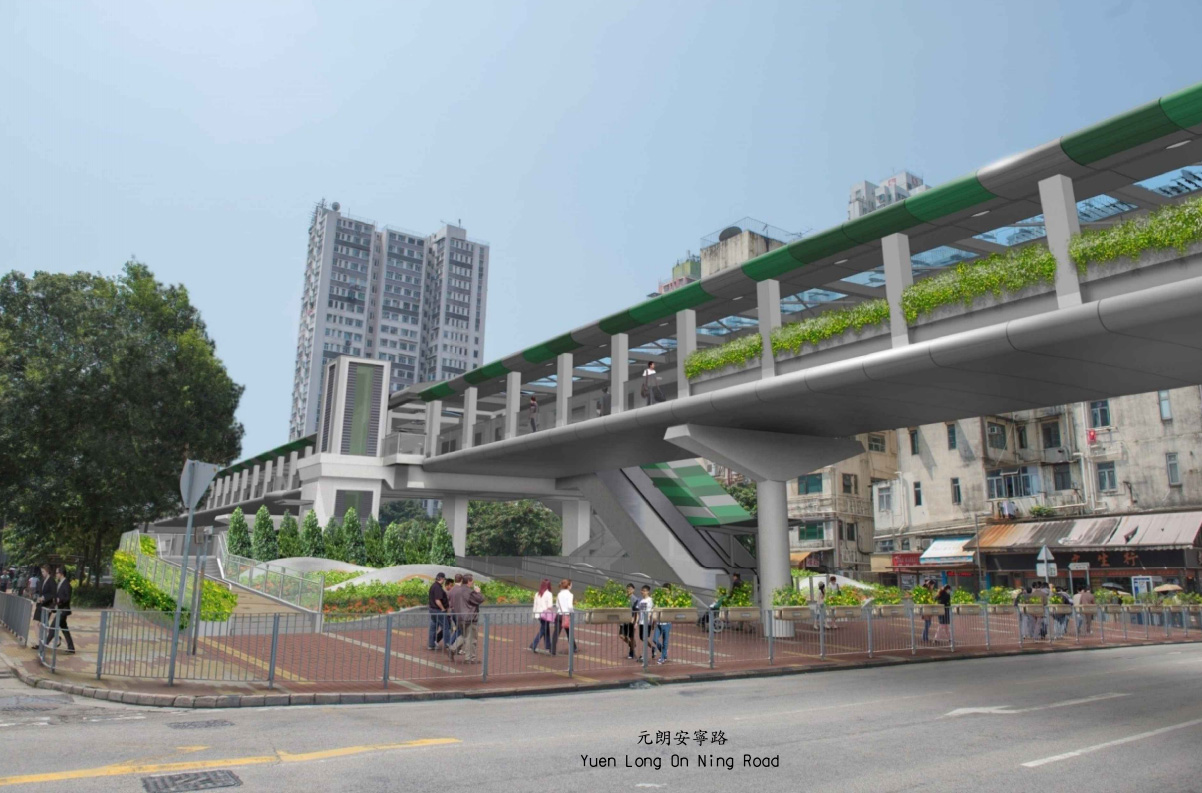 路政署指,天橋連接朗屏站至元朗市,工程預計於今年7月展開,為期約50個月。工程主要包括由朗屏站至教育路以南,沿元朗市明渠建造一條長約540米、淨闊6米的有蓋高架行人通道;在元朗安寧路、青山公路元朗段和教育路的路旁興建合共6個行人接駁平台,提供樓梯、升降機和自動梯,以連接有蓋高架行人通道和地面行人路;及進行相關的道路、渠務、公用設施、公共照明、環境美化和機電工程。