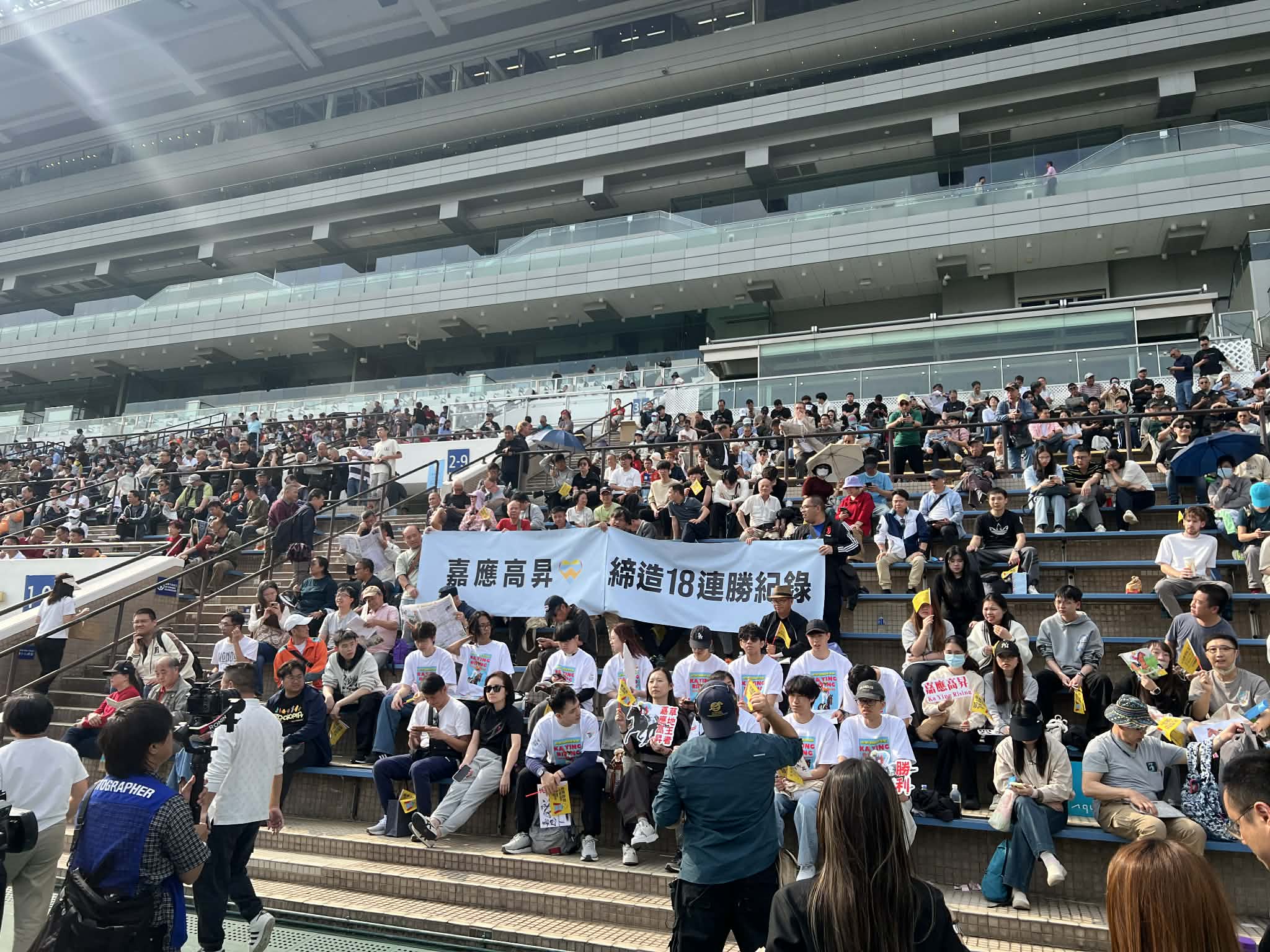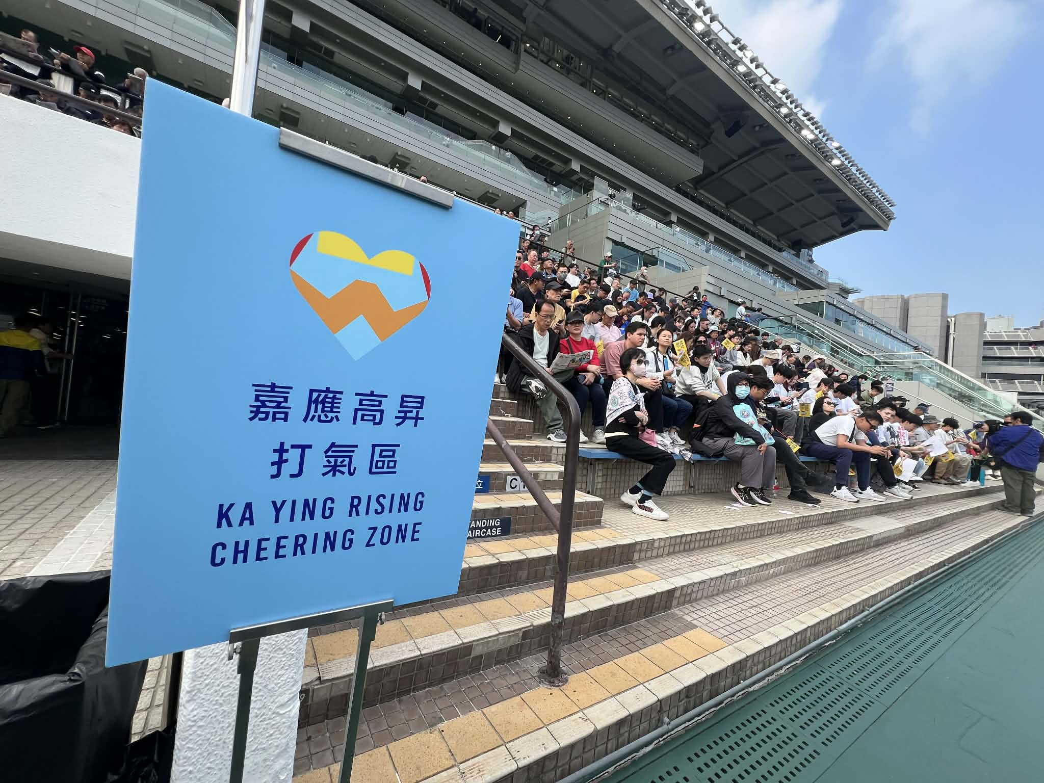 在沙田馬場,馬會特別安排打氣專區,讓「嘉應高昇」的支持者為愛駒打氣。