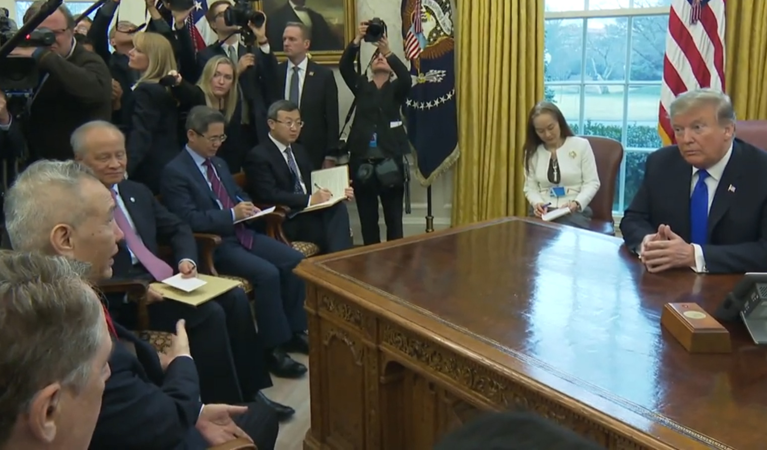 中美貿易代表於華盛頓舉行第七輪高級別經貿磋商,雙方需加開兩日會議。美國總統特朗普周五(2月22日)在白宮橢圓型辦公室,會晤中國副總理劉鶴。特朗普表示,雙方取得很多進展,很大機會達成協議,他指如果見到實質進展,願意推遲下月1日的談判期限。