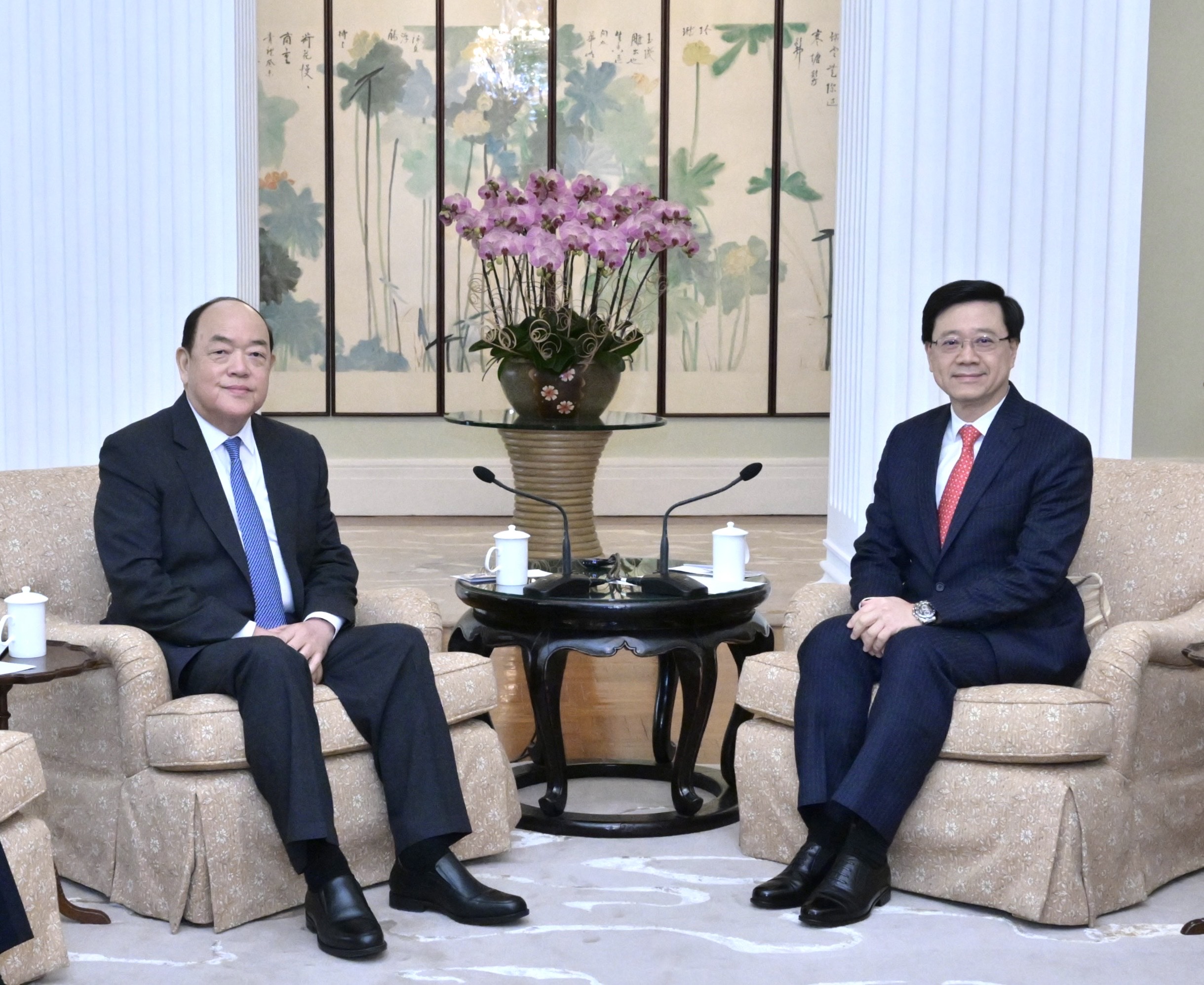 行政長官李家超今日(2月25日)在禮賓府與澳門特首賀一誠會面,就推動港澳合作和粵港澳大灣區高質量發展交換意見。律政司司長林定國、文化體育及旅遊局局長楊潤雄、政制及內地事務局局長曾國衞和行政長官辦公室主任葉文娟亦有出席。
