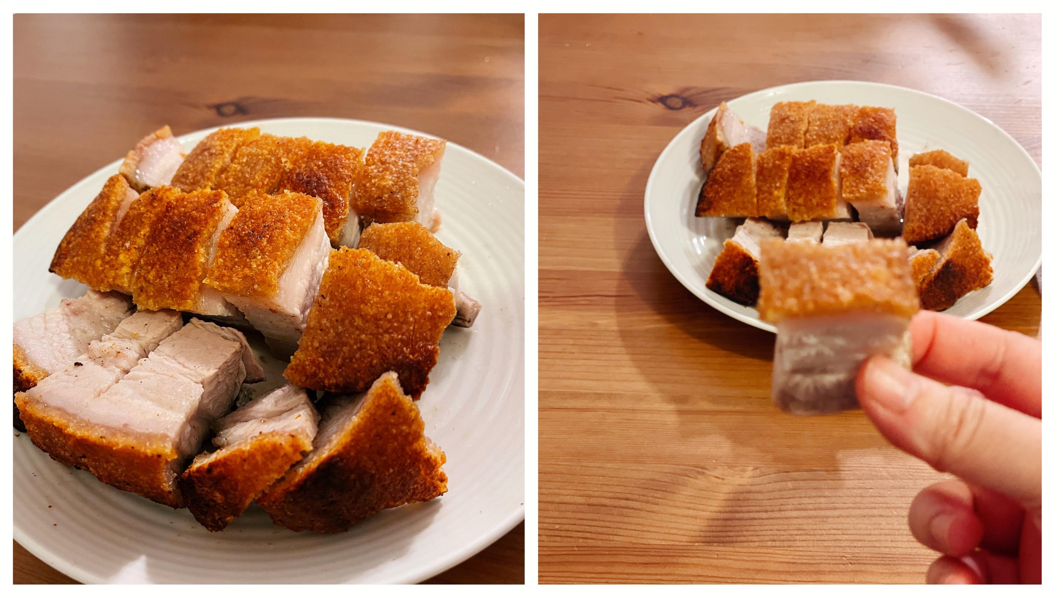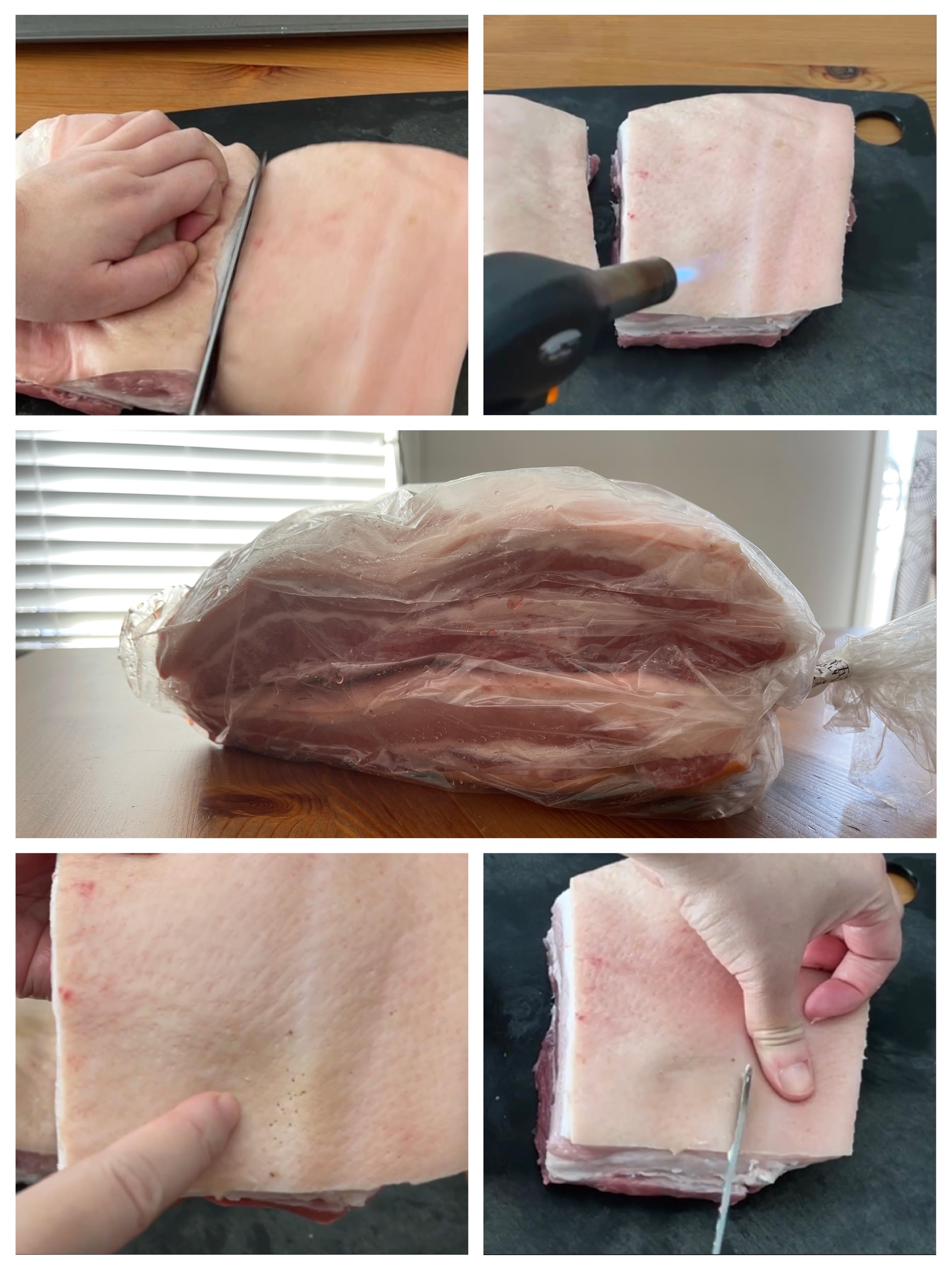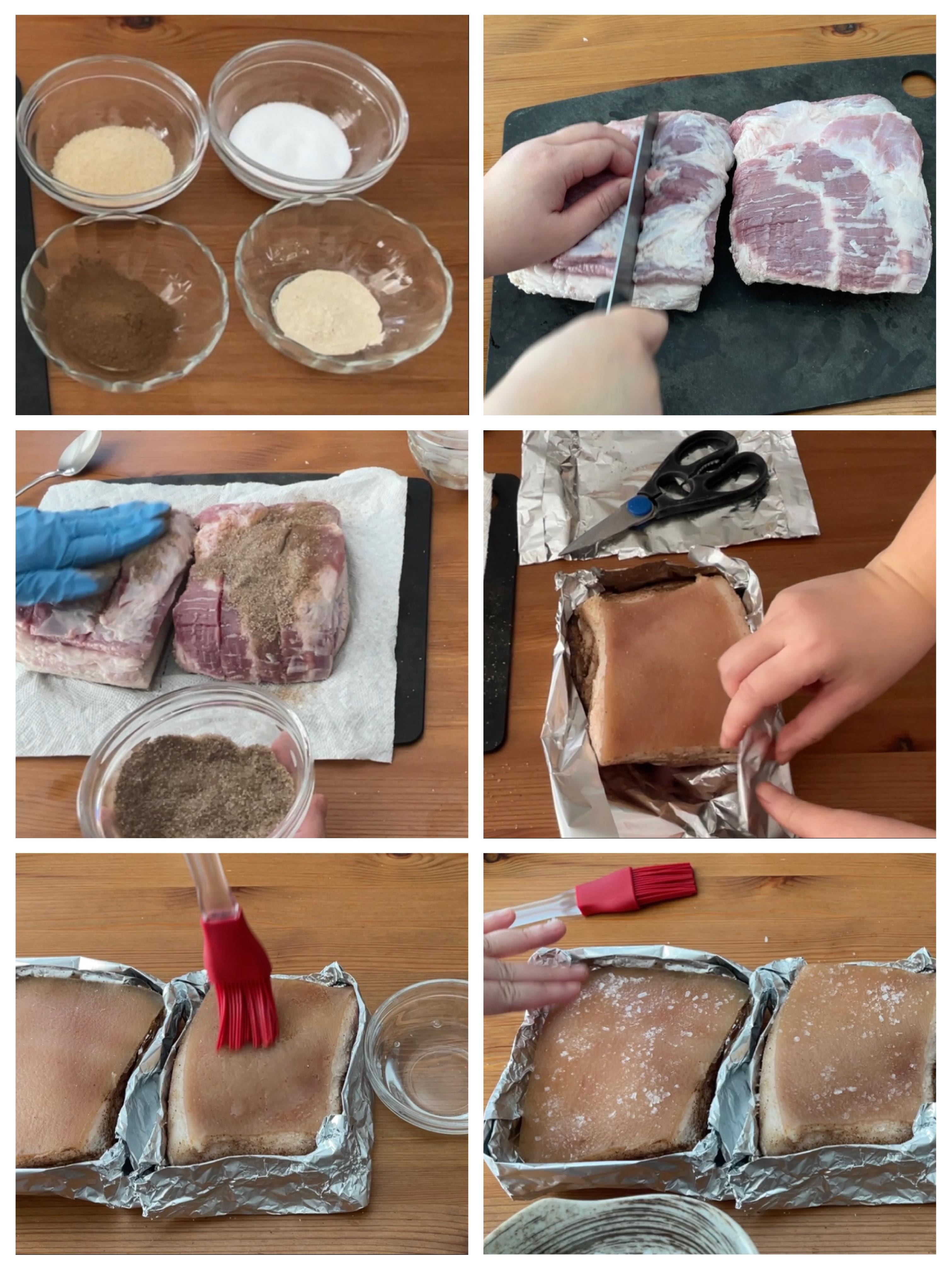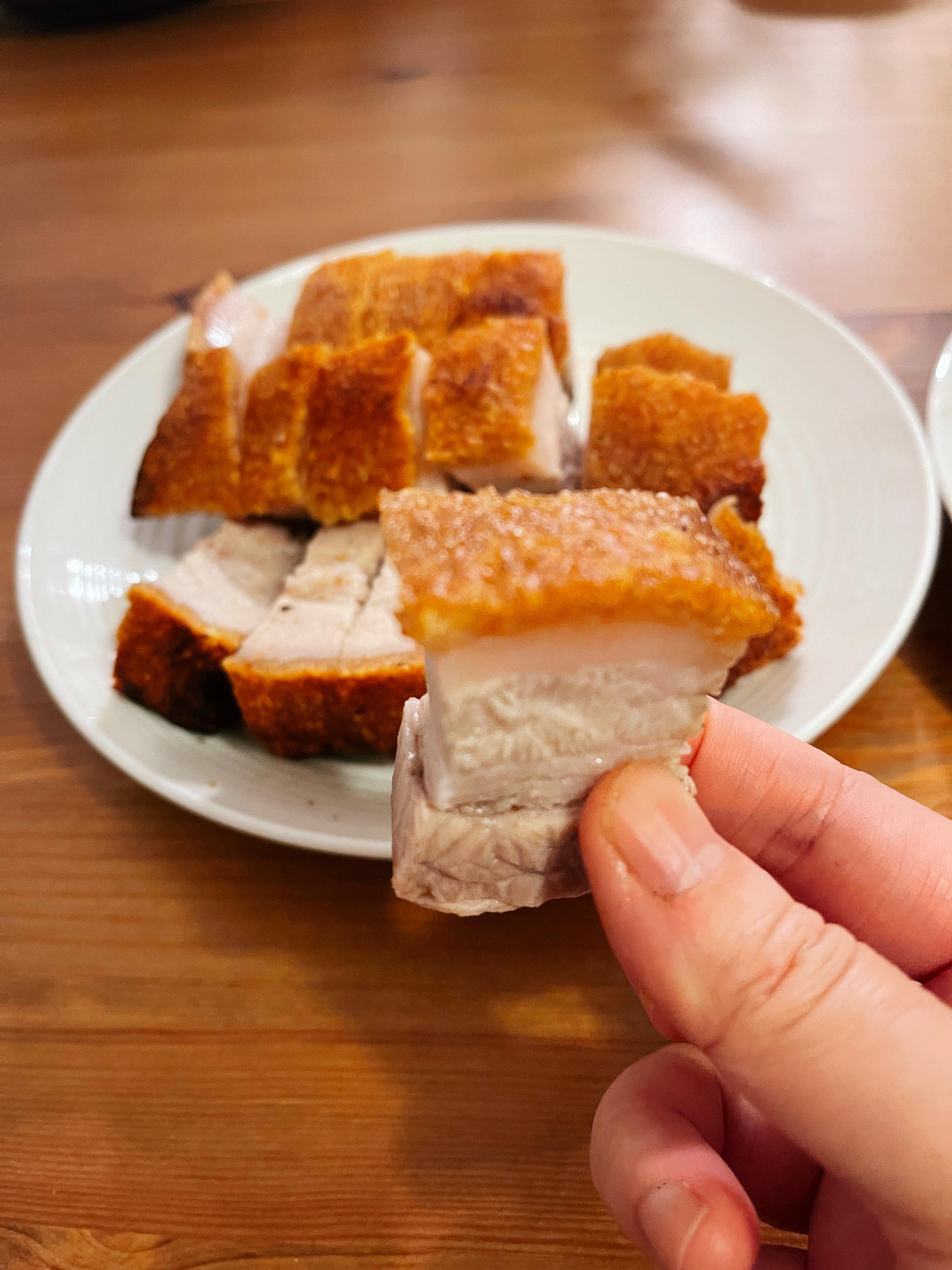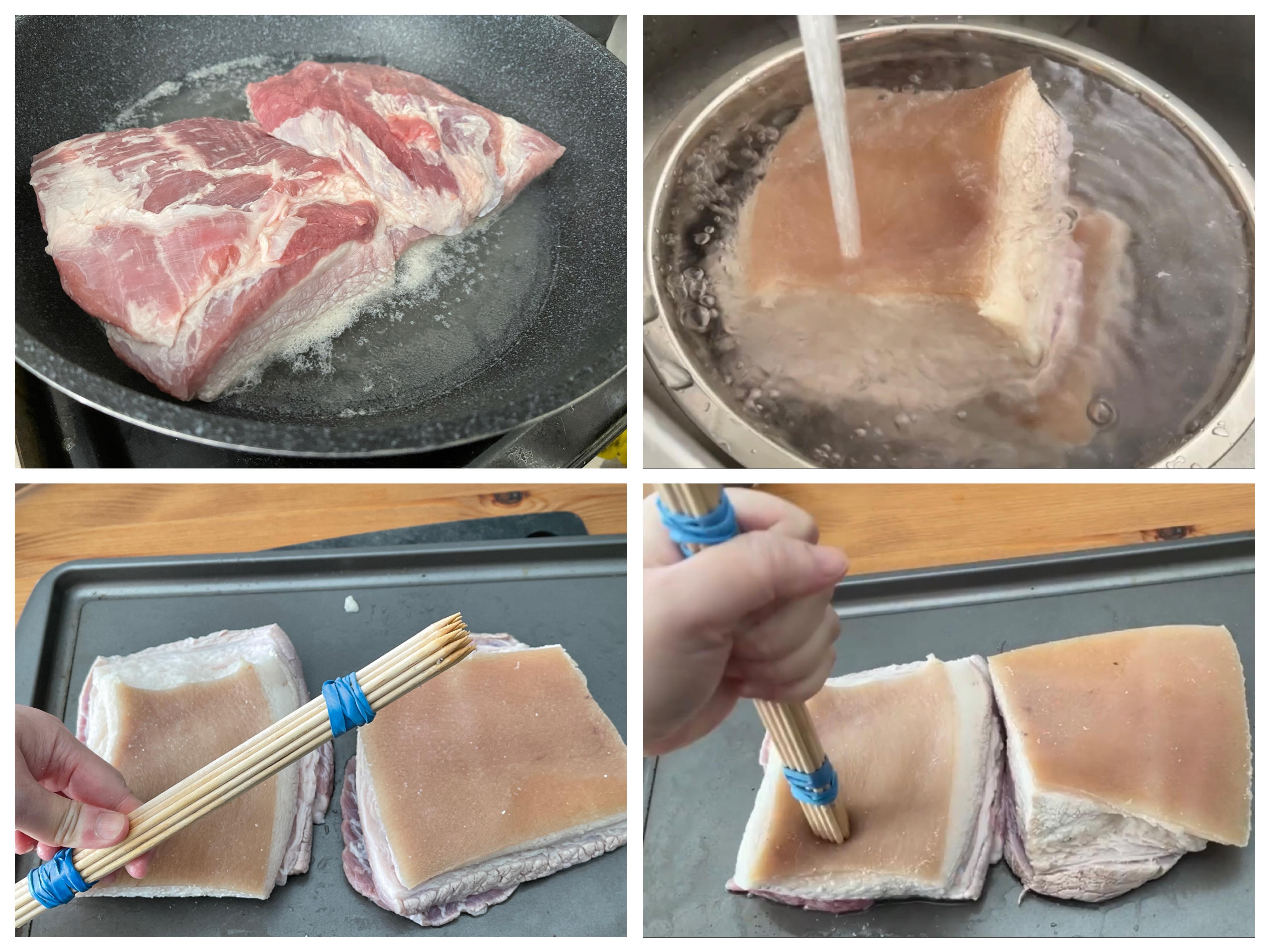 *豬皮在焗或煎次前要確保是乾硬的,焗時就會爆得好,出來才會有鬆脆的口感