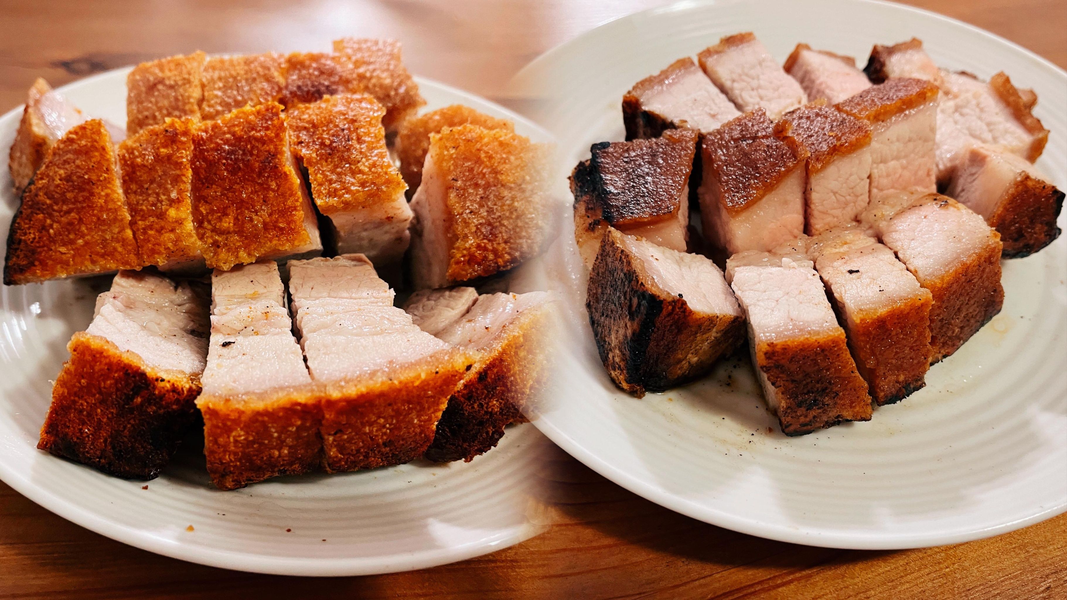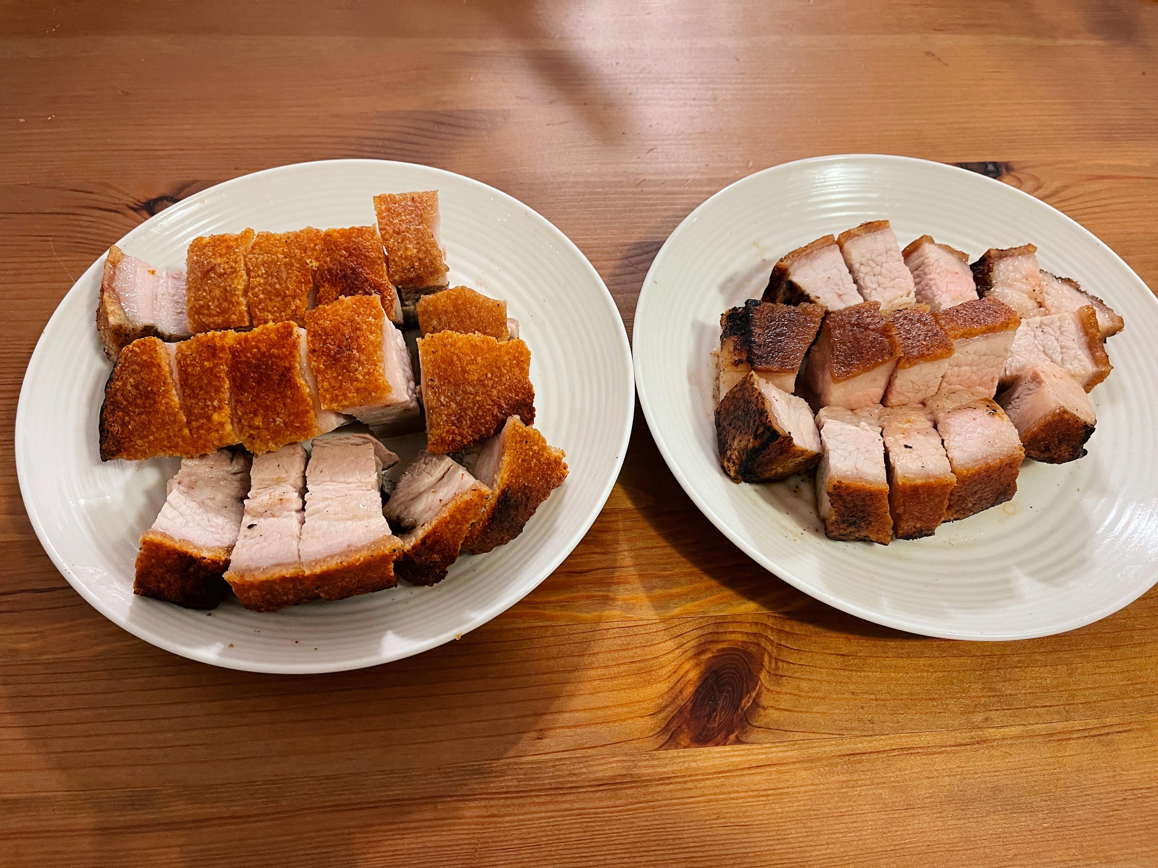 我很想做出外脆內多汁的燒肉,找簡單易做法,近年進化到用醋加梳打粉,真的嗎?不是用來洗煲?用來做燒腩仔?我又試過真的不錯,但最近又有一說是掃酒,我今次用混合的方法預備豬肉,再分兩種方法煮,一是蒸焗一是煎,出來是蒸焗效果好好多,而試過豬皮掃酒後還是覺得只用醋和梳打粉就夠了,不用多此一舉,各位也來試試吧!