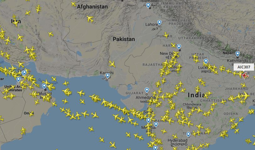 (flightradar24.com截圖,見到大部份航班都繞過巴基斯坦)