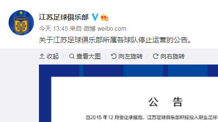 官方公告指出,由於各種無法控制的要素疊加,江蘇足球會無法有效保障繼續征戰中超及亞冠賽場。近半年來多方奔走尋求承接,以極大的誠意轉讓股權,不放棄江蘇足球會傳承的一絲機會。