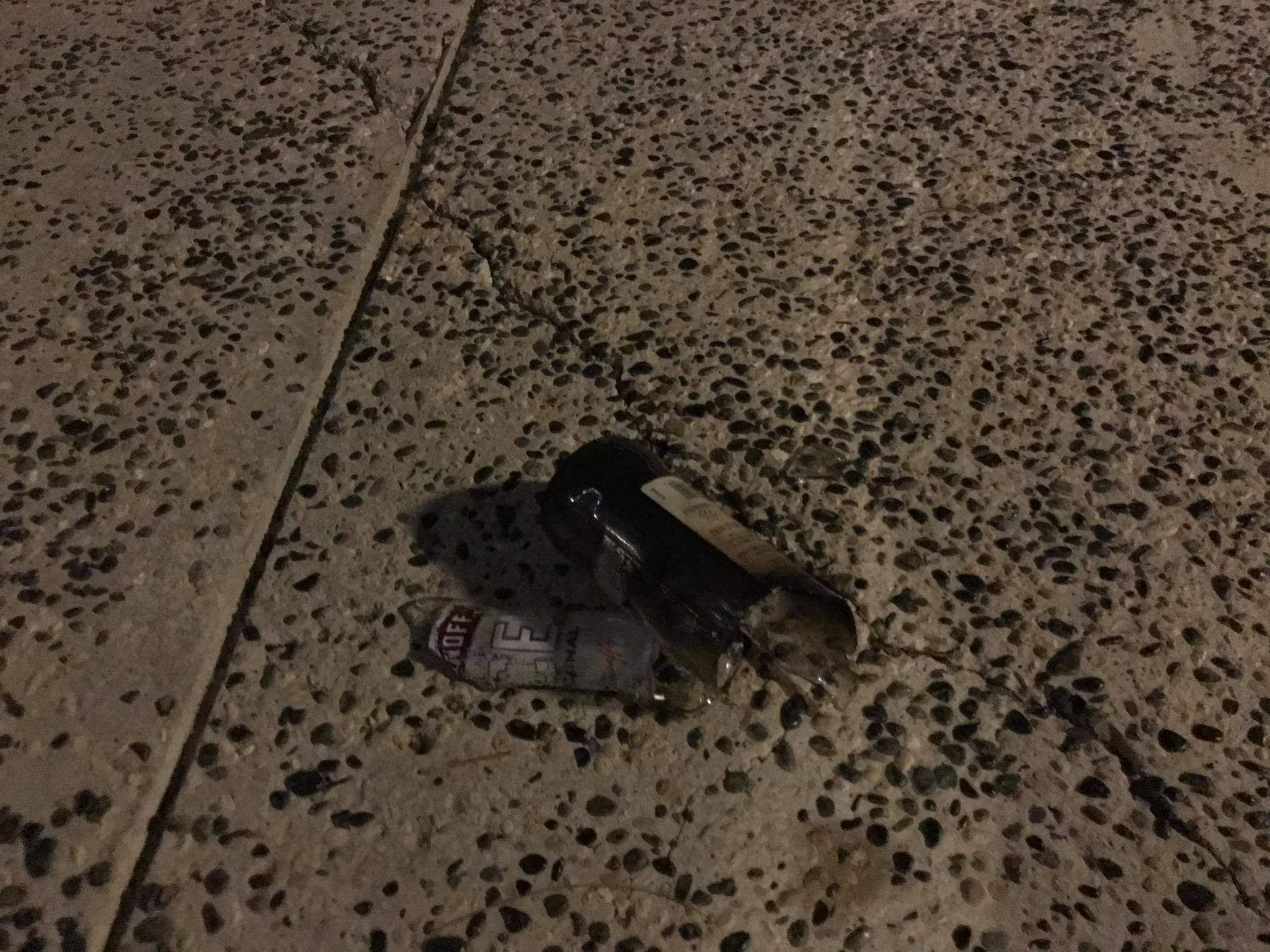 現場遺下玻璃樽碎片,長櫈熏黑。