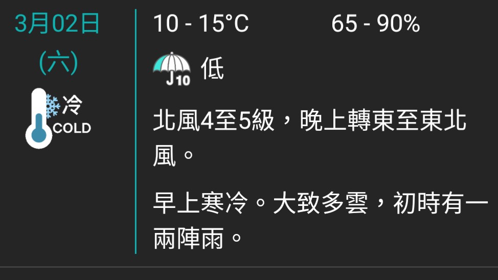 受東北季候風及一道廣闊雲雨帶影響,廣東沿岸地區天氣寒冷。今日(3月1日)下午氣溫進一步下降,本港大部分地區氣溫維持在12度或以下。
