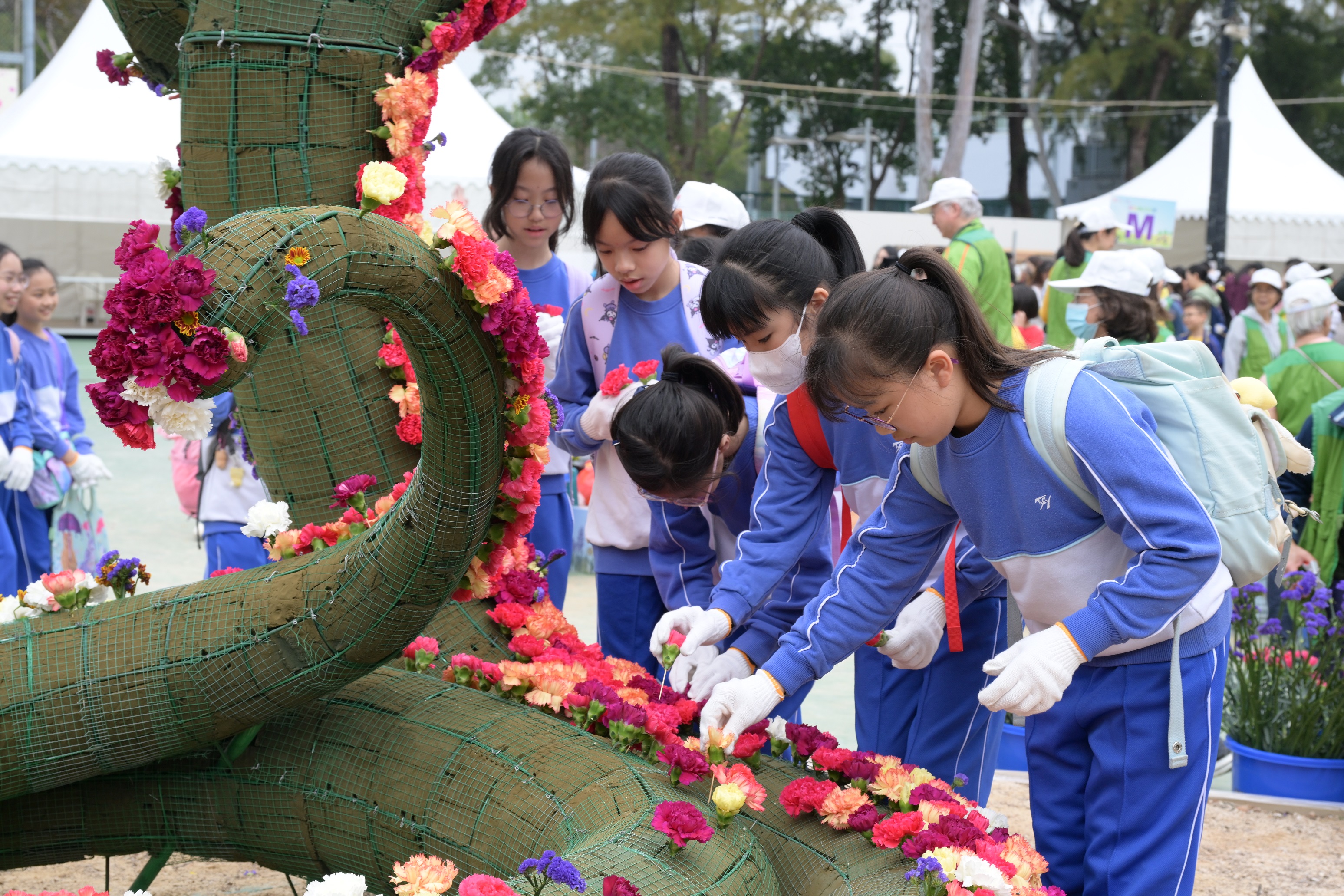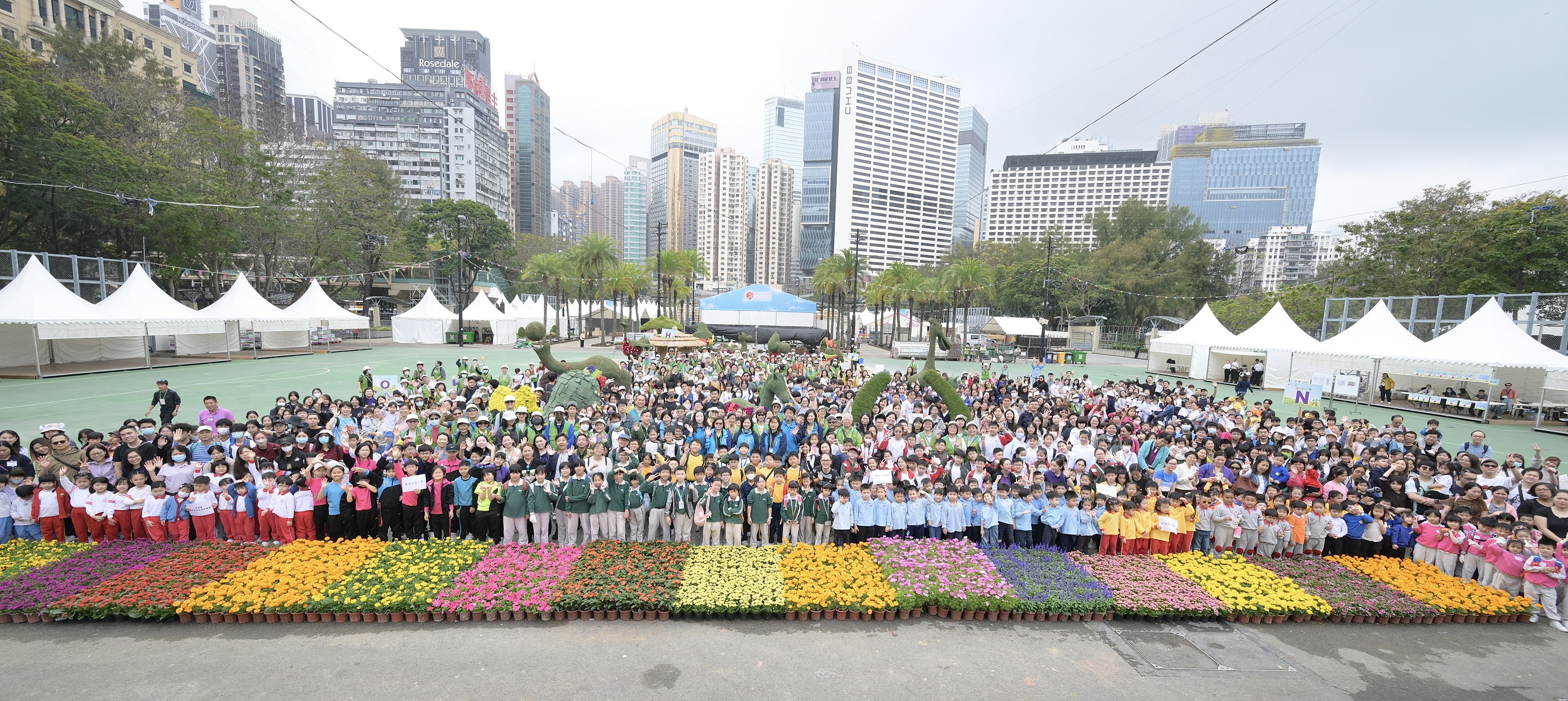 超過1100名來自38間幼稚園、中小學和特殊學校的學生,今日(3月1日)於維多利亞公園參與「賽馬會學童鑲嵌花壇」活動,在約140名綠化義工指導下,協助鑲嵌大型花壇「非洲獵奇」。花壇為即將舉行的香港花卉展覽的主要特色景點之一。