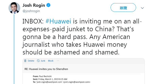 《華盛頓郵報》專欄作家Josh Rogin於周五(3月1日)在Twitter貼文,指華為邀請他前往中國訪問。Josh Rogin拒絕邀請,指基於《華盛頓郵報》政策與個人道德,不得接受作為外國政府情報機構一部分的外國企業,多達數千美元的餽贈。他還指任何收取華為金錢的美國記者,應感到羞恥及被譴責。
