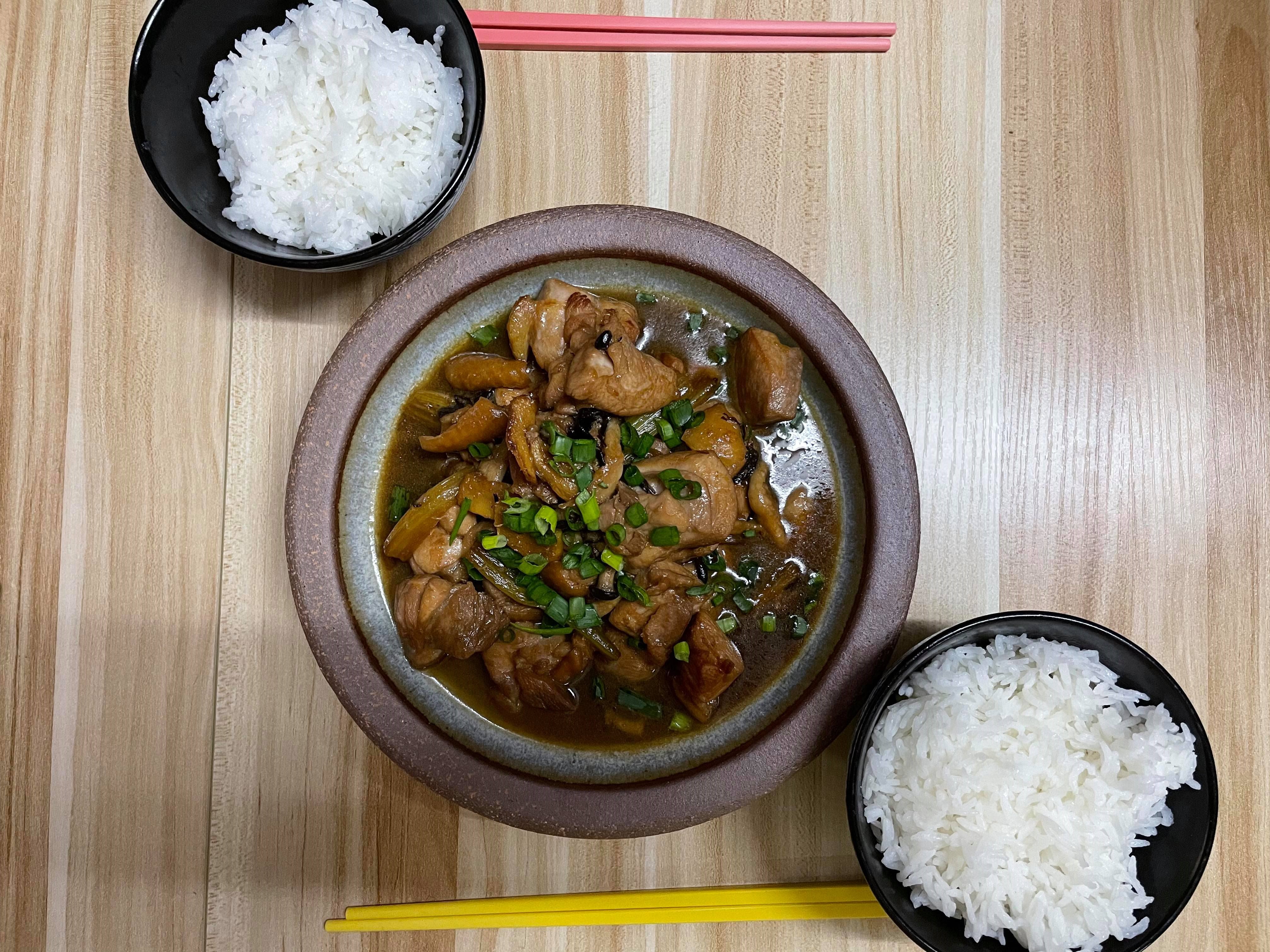7. 加入豉油、冰糖,將冰糖炒至融化,此時如有準備菌類可在此時倒入,輕輕炒一下。