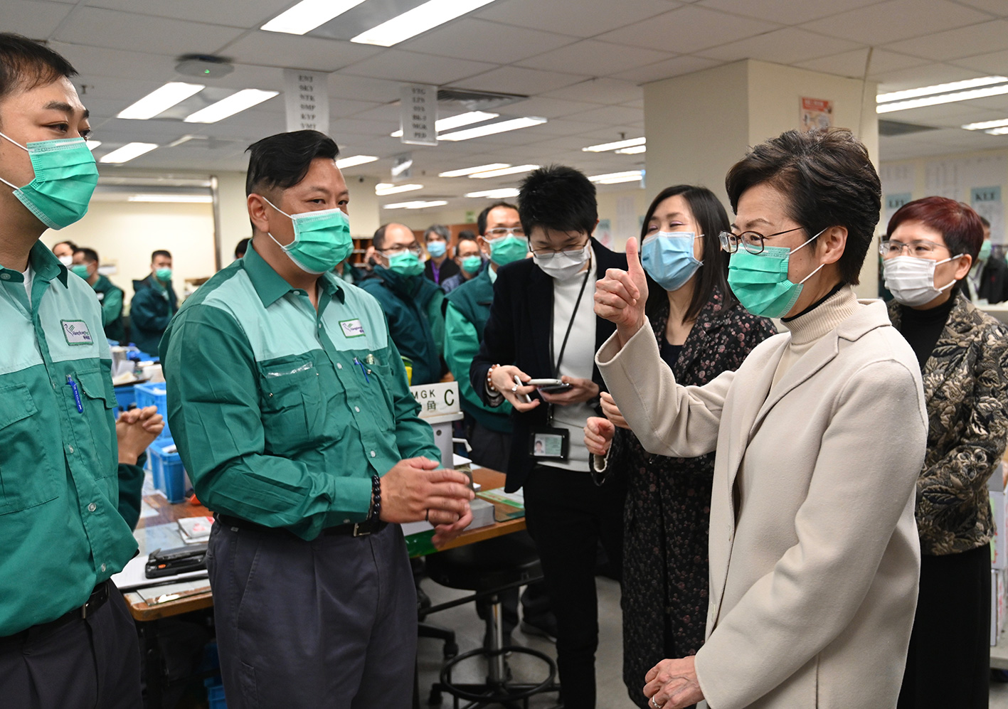 林鄭月娥讚賞郵務人員以民為本的服務精神,因應市面口罩供應緊張,主動找出並優先派遞載有口罩的郵包,以照顧市民的需要。她感謝郵務人員的努力,並鼓勵他們繼續為市民提供優質服務。