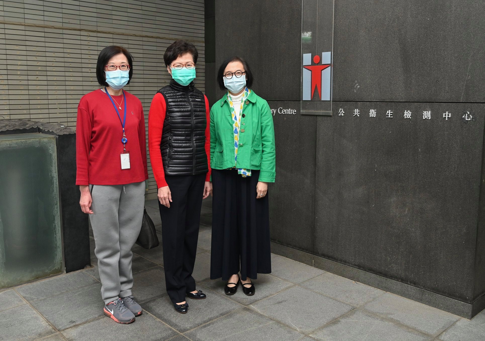 林鄭繼續各區的巡迴騷,今日聯同兩位「抗疫」姊妹,即食物及衞生局局長陳肇始和衞生署署長陳漢儀,到臨時在衞生署公共衞生檢測中心成立的熱線中心,探望負責聯絡正接受強制檢疫或醫學監察人士的同事,他們大多數來自衞生署各個單位,不少是女同事,感謝她們為抗疫出力。