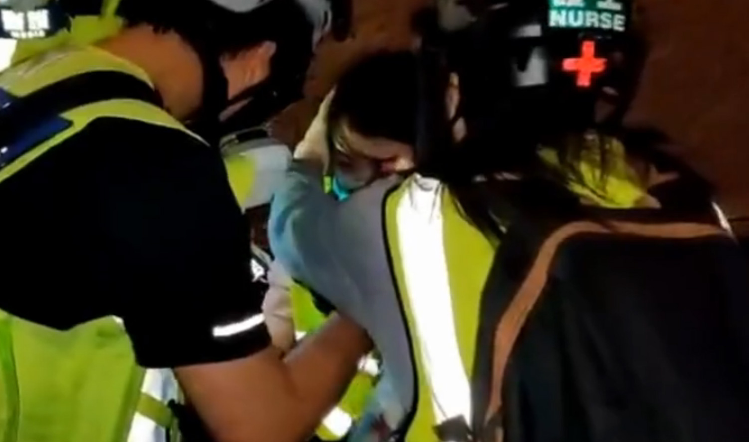 昨晚有市民響應號召,到將軍澳悼念4個月前於停車場墮斃的科大學生周梓樂。一名有線電視女記者,突被一名防暴警察從後推跌,頭部受傷。