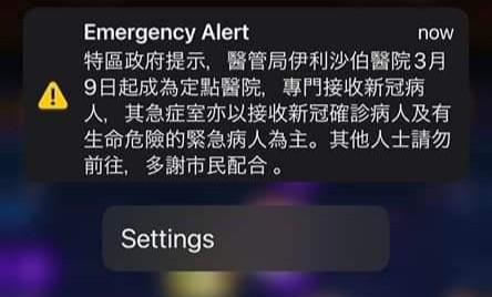昨日(3月9日)近傍晚6時,政府首度向手提電話用戶發出緊急警示,指伊利沙伯醫院將於3月9日起,成為定點醫院,專門接收新冠病人,籲其他人士請勿前往。