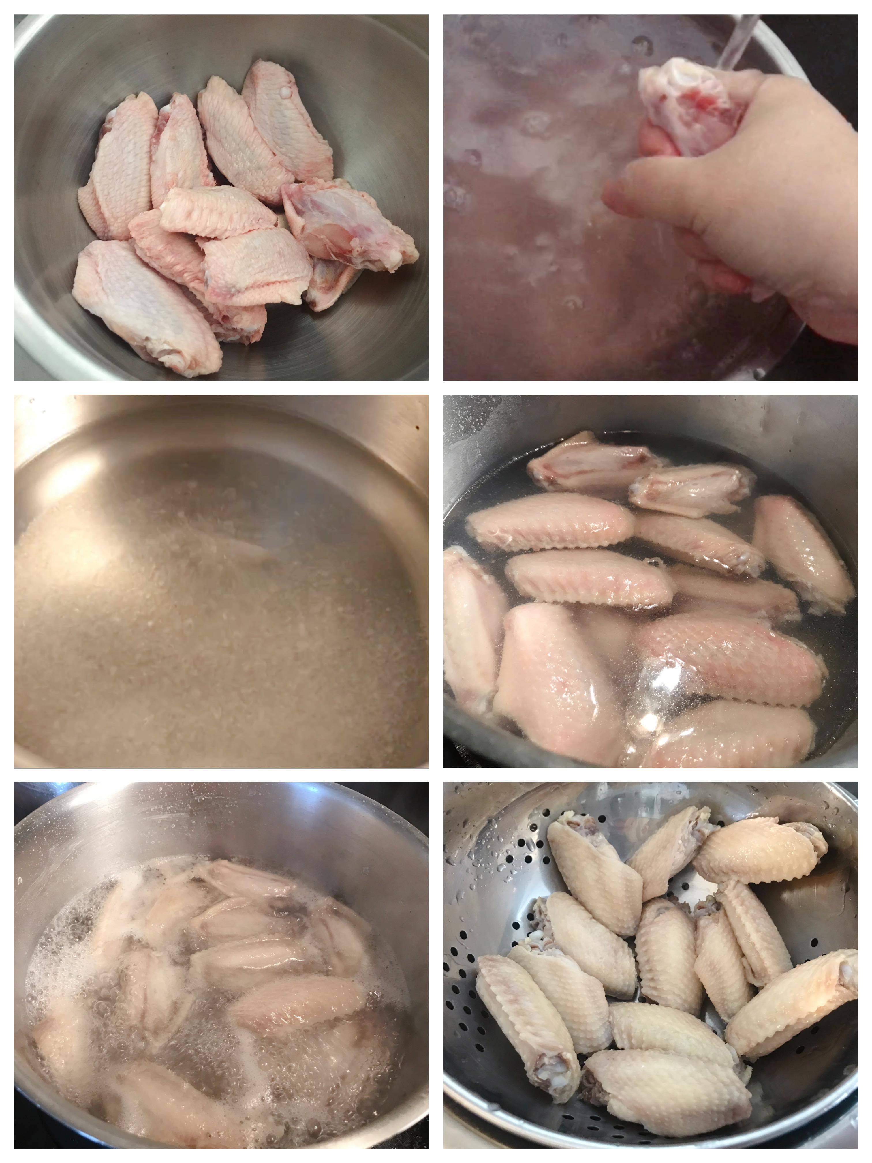 (1)將雞翼由冰格放入雪櫃一晚解凍,然後用水以慢慢的水流清洗血水,用手輕輕力掐出血水再清洗乾淨。先用鹽拌洗雞翼再一起浸水(洗走血水)