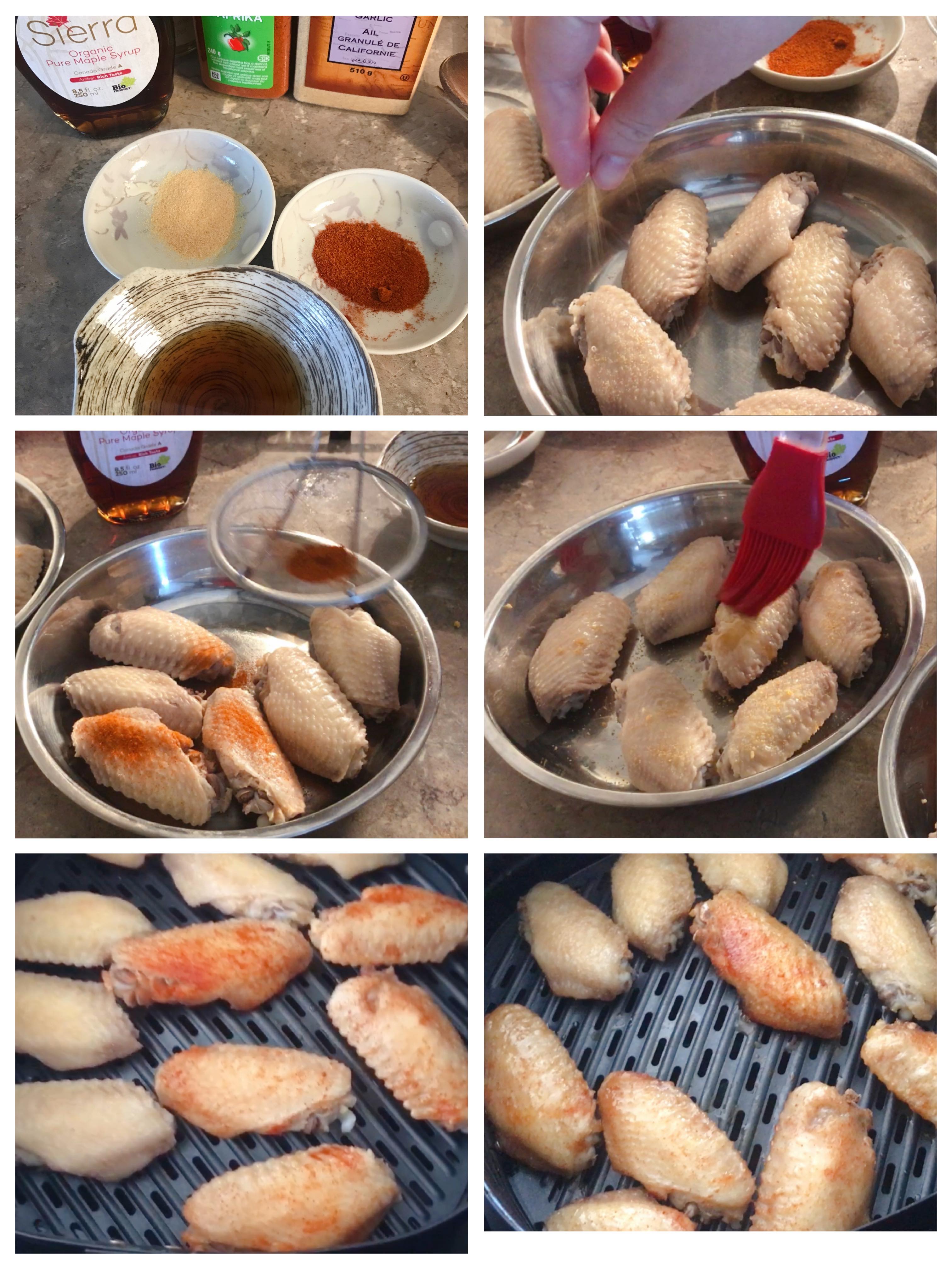在雞翼上下分別撒上蒜粉或香辣粉,再掃上楓樹糖漿或蜜糖,氣炸鍋375華氏190攝氏預熱幾分鐘,放入雞翼,以375華氏190攝氏氣炸6分鐘,打開可以再掃一掃楓樹糖漿或蜜糖,再以400華氏200攝氏氣炸3至4分鐘,即可供食。
