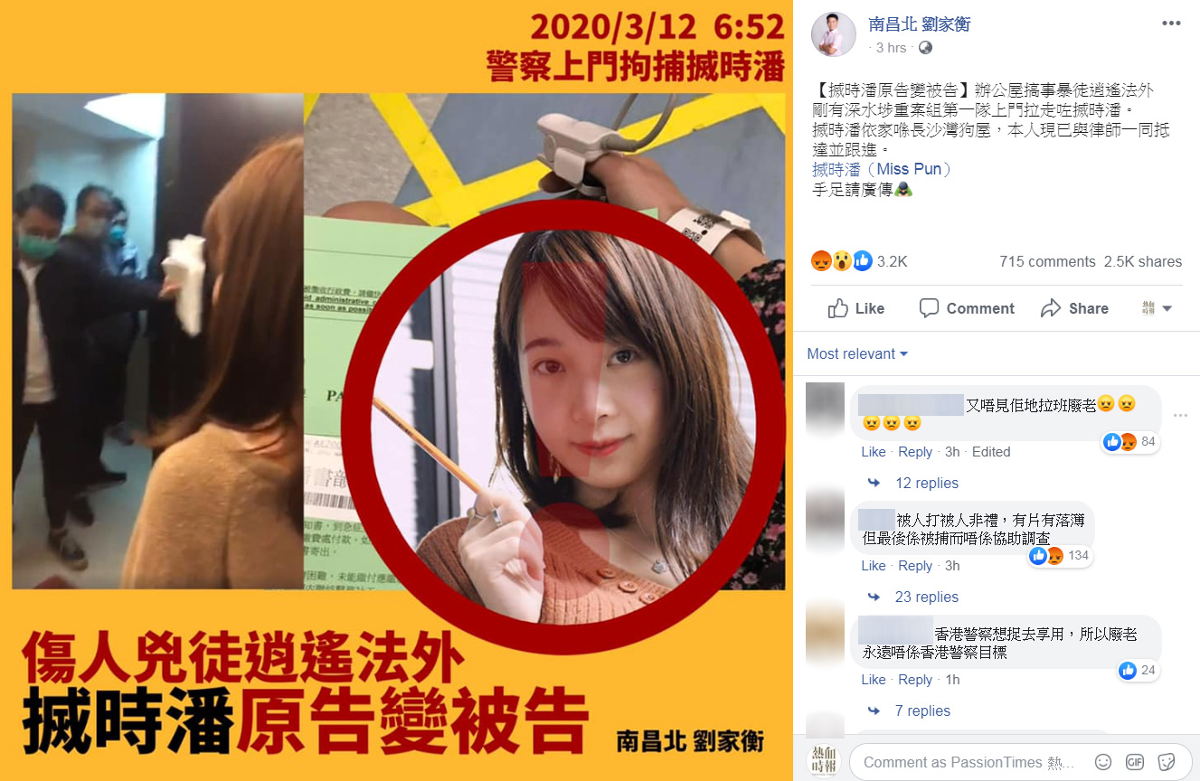 劉家衡在社交網站表示,「搣時潘原告變被告,辦公屋搞事暴徒逍遙法外」,他透露深水埗重案組第一隊上門,將「搣時潘」帶到長沙灣警署,已經有律師跟進。