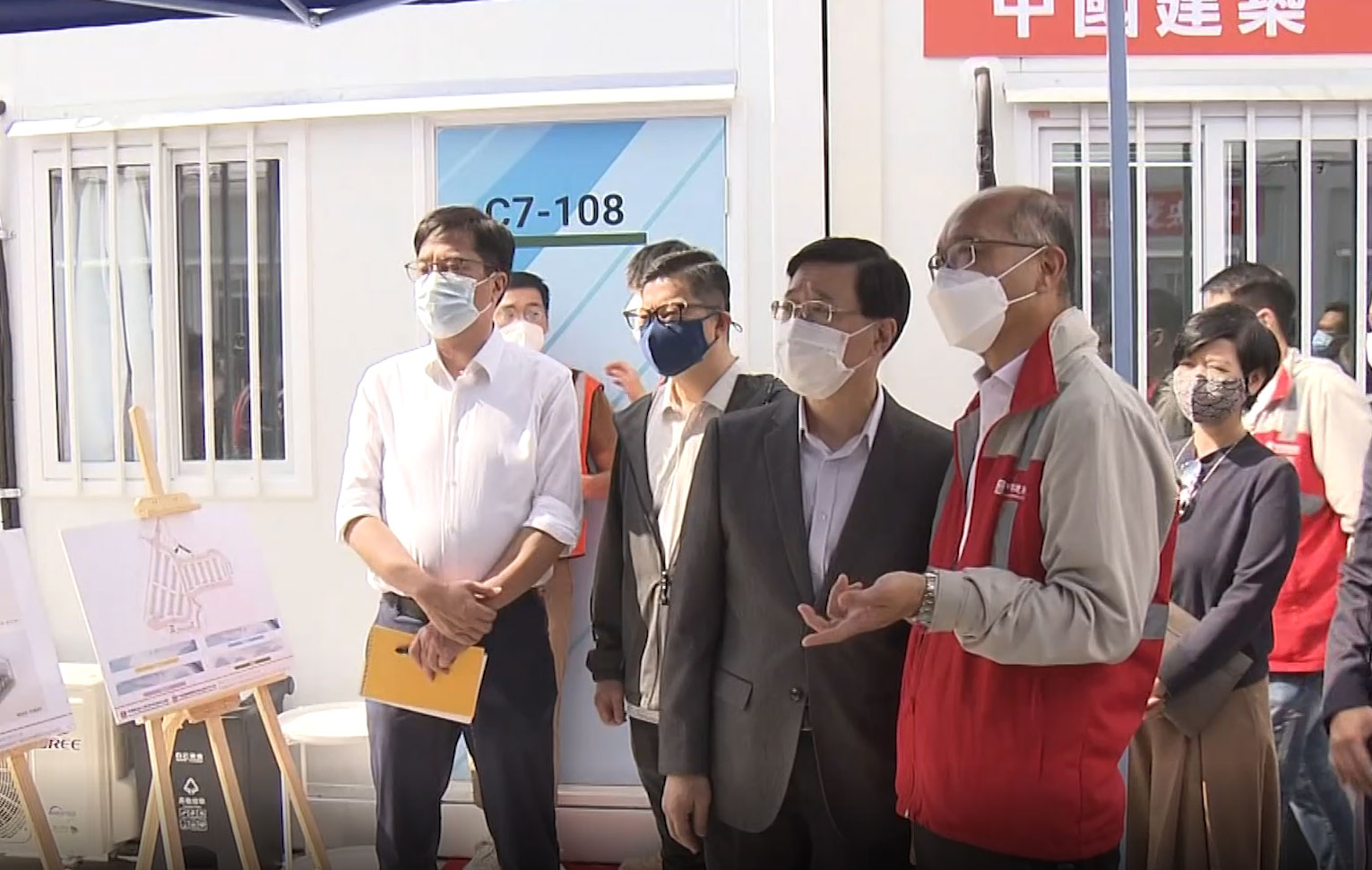 政務司司長李家超今日(3月13日)上午到粉嶺馬適路視察接收第四個由中央援建的社區隔離設施。該項目位處粉嶺北新發展區,由發展商借出土地供政府迅速興建臨時隔離設施。投入運作後,粉嶺設施將提供約350個房間和約1000張應急隔離床位。