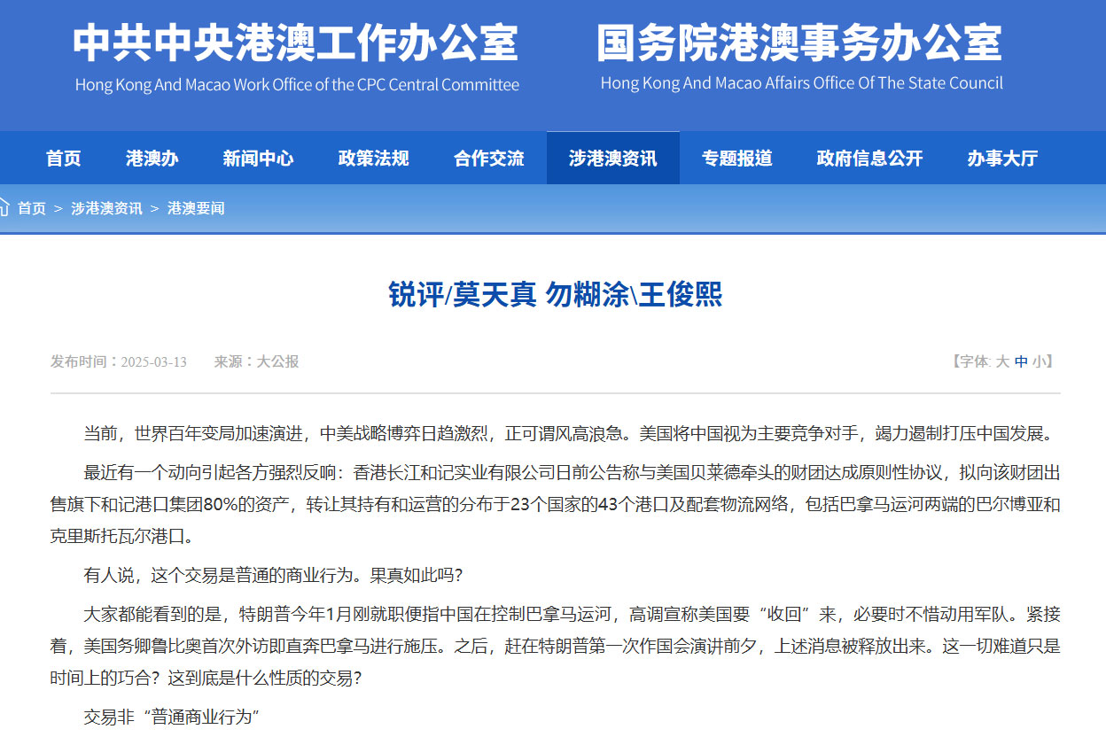 《大公報》一篇有關長和計劃出售巴拿馬運河兩端港口等資產的評論文章,獲國務院港澳辦網站轉載。