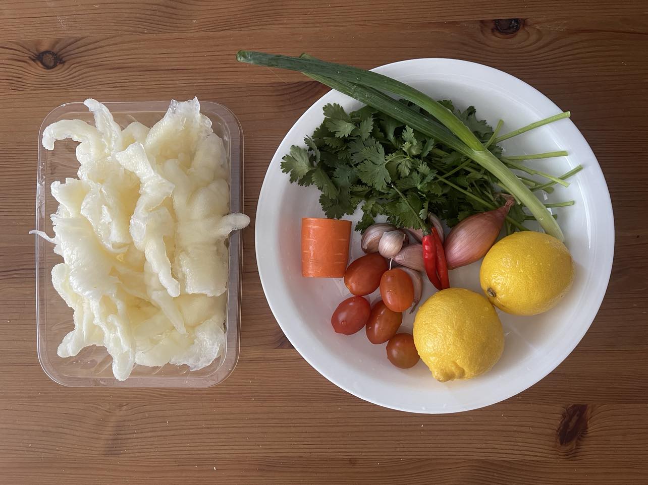 材料:無骨鳳爪 600克/小蕃茄 10個/檸檬1個/蒜頭3粒/乾蔥1個/蔥1條/辣椒1隻/芫茜1把/紅蘿蔔少許