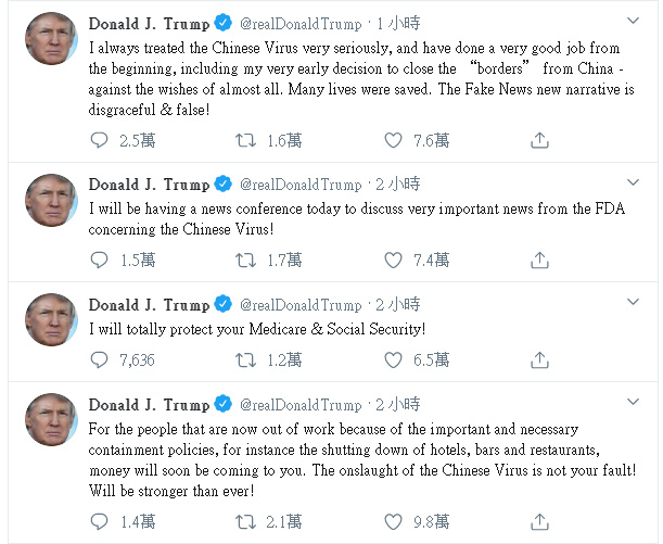 美國總特朗普繼續在Twitter發功,周三(3月18日)連出4個tweets談及疫情問題,當中3個再次使用「中國病毒」(Chinese Virus)字眼。