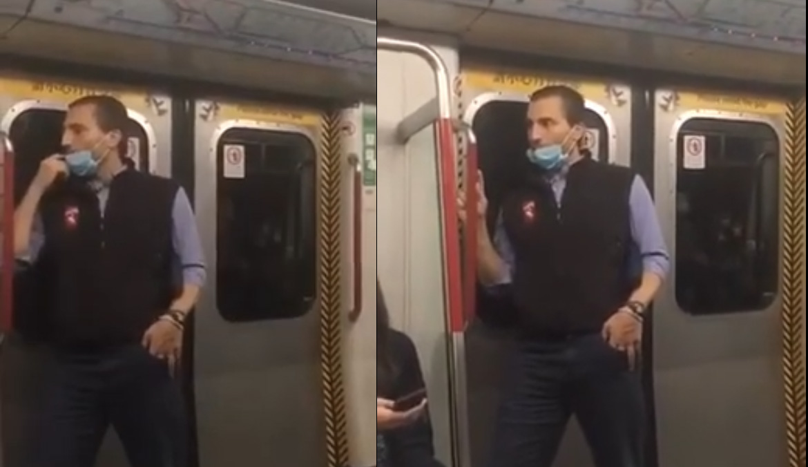 網上流傳一條片段,見到一名外籍男子於港鐵車廂內拉開口罩,手指沾口水後抹在扶手上。