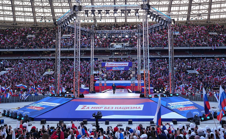 普京在演說中,肯定俄羅斯在烏克蘭境內發起「特別軍事行動」、接揚俄軍英勇。在球場內,有數以千計觀眾揮舞著俄羅斯國旗。