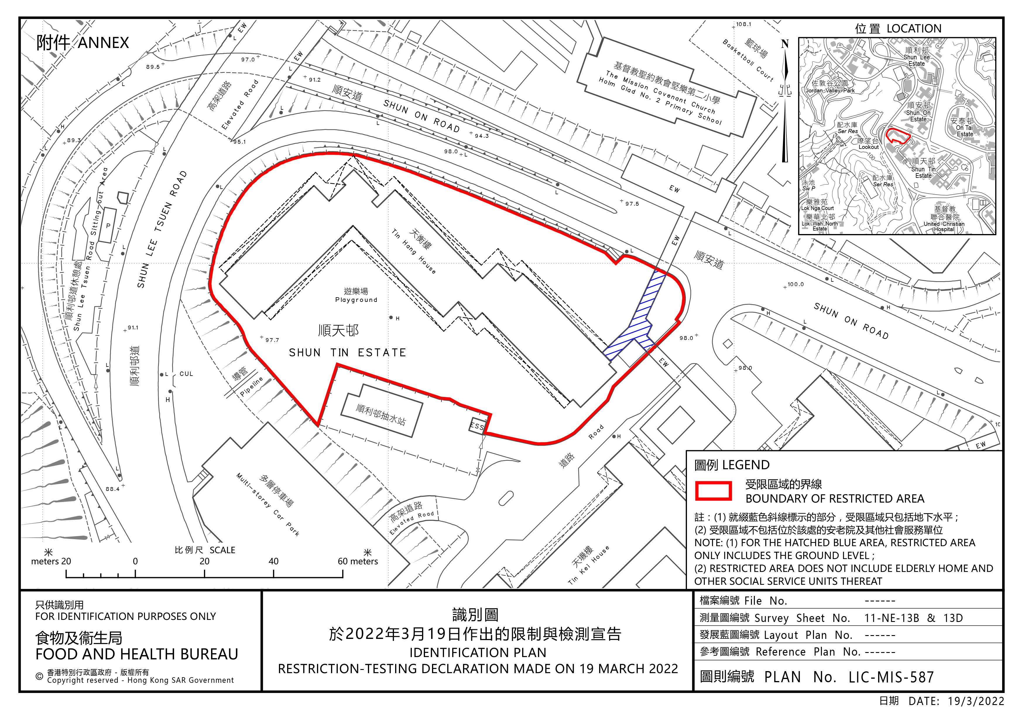 政府今日(3月19日)引用《預防及控制疾病(對若干人士強制檢測)規例》(第599J章),作出限制與檢測宣告,自下午5時起限制在觀塘指明「受限區域」,即觀塘順天邨天衡樓內的人士,須留在其處所並接受強制檢測。受檢人士須在其處所等候,直至「受限區域」內所有已識別的受檢人士完成檢測,而相關檢測結果亦已獲大致確定,方可離開其處所。政府目標是在明日(3月20日)約下午1時完成此行動,視乎檢測結果,行動或會延長。