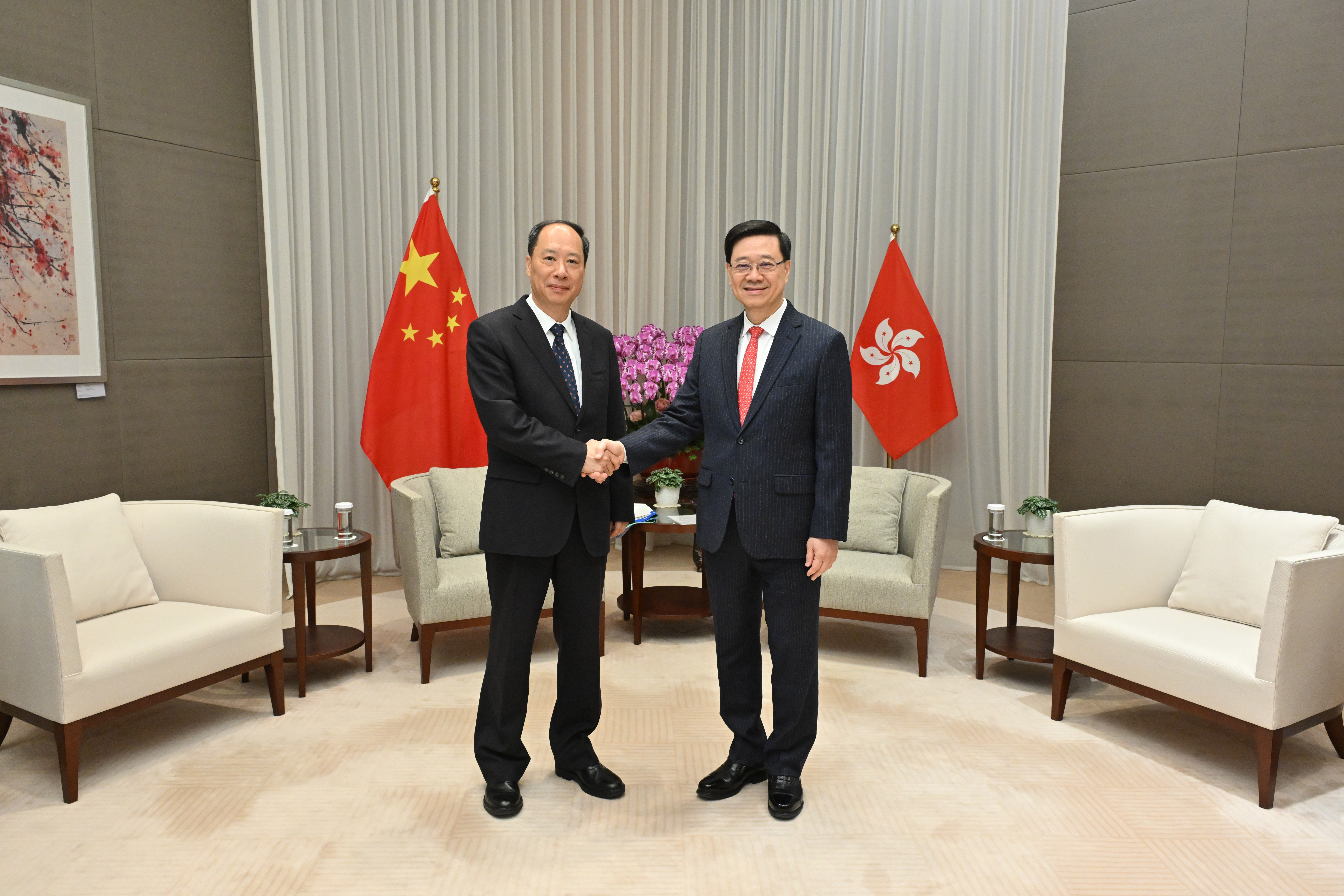 行政長官李家超今日(3月19日)與江門市委書記陳岸明會面,就進一步深化港邑合作及推動粵港澳大灣區高質量發展交流意見。