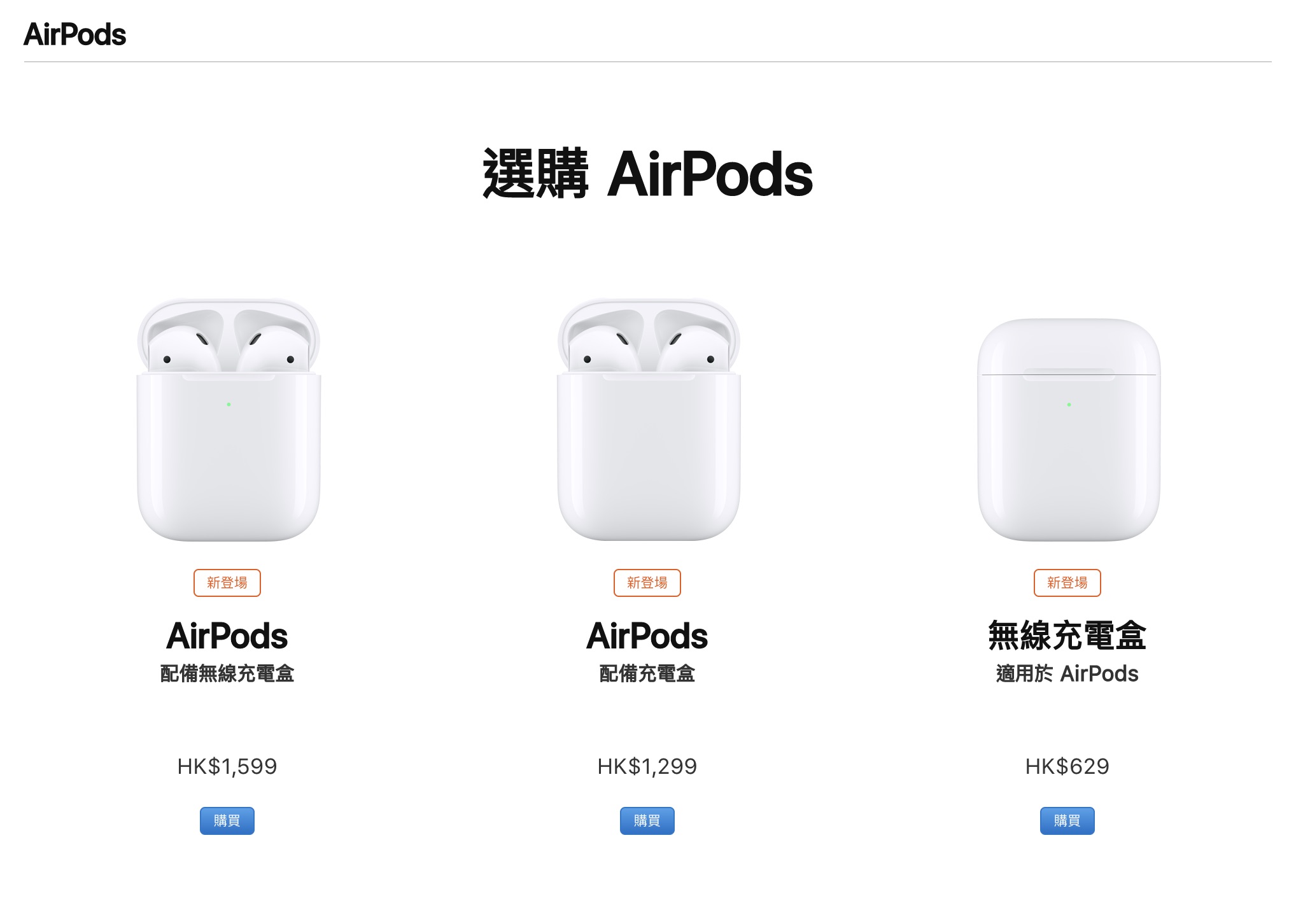 價格方面,配備無線充電盒的AirPods 為$1599,配備標準充電盒的Airpods 為$1,299 ,而其無線充電盒則為$629。