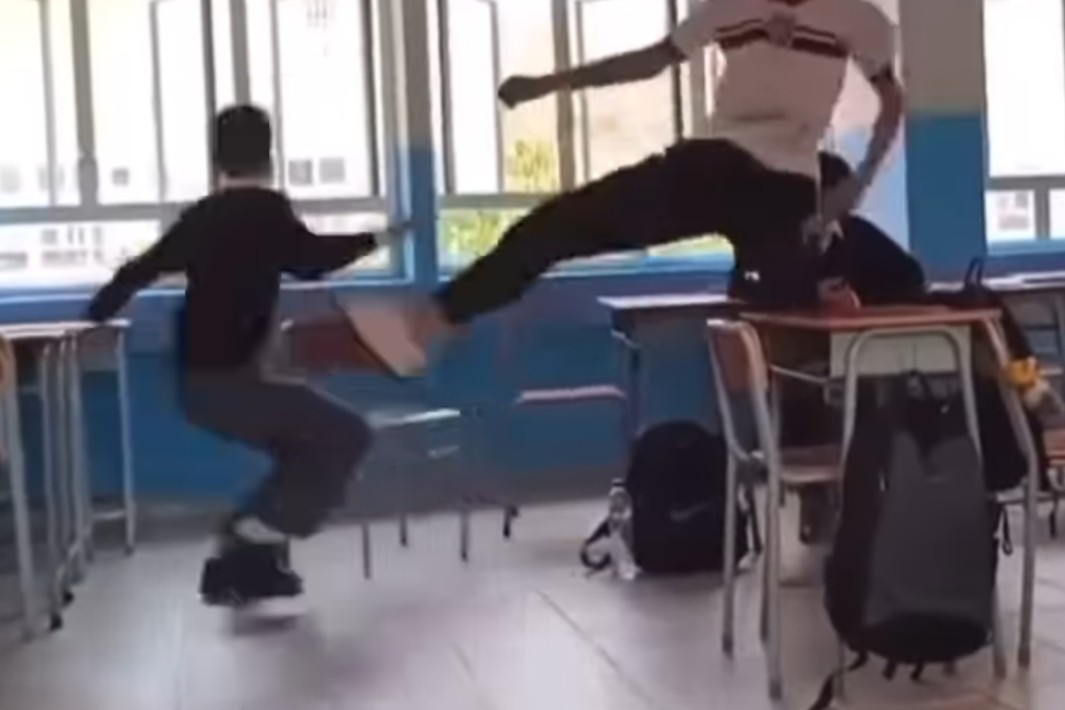網上流傳一條短片,指九龍工業學校一個課室內,一名男生向同學起飛腳,並把對方凌空摔倒。