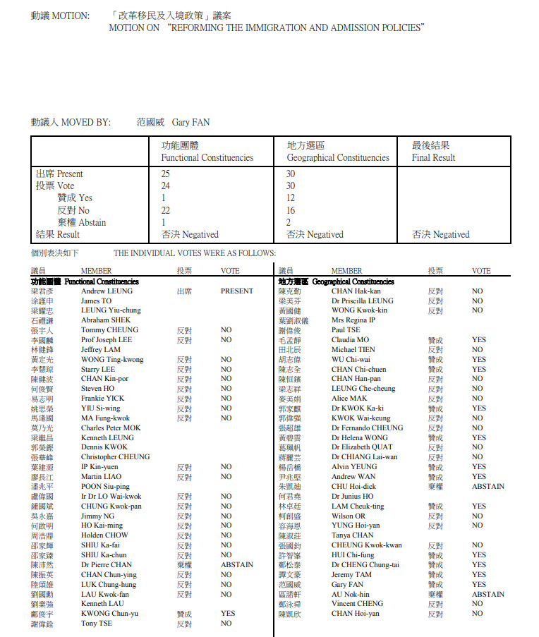 功能團體方面,僅得1票贊成、22票反對、1票棄權,而地方選區方面,就有12票贊成、16票反對、2票棄權。