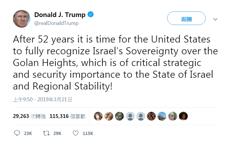 美國總統特朗普在Twitter表示,經過52年,美國全面承認以色列擁有戈蘭高地主權的時候已經到來,他又指戈蘭高地對以色列及隣近地區安全,具極大戰略及重要價值。