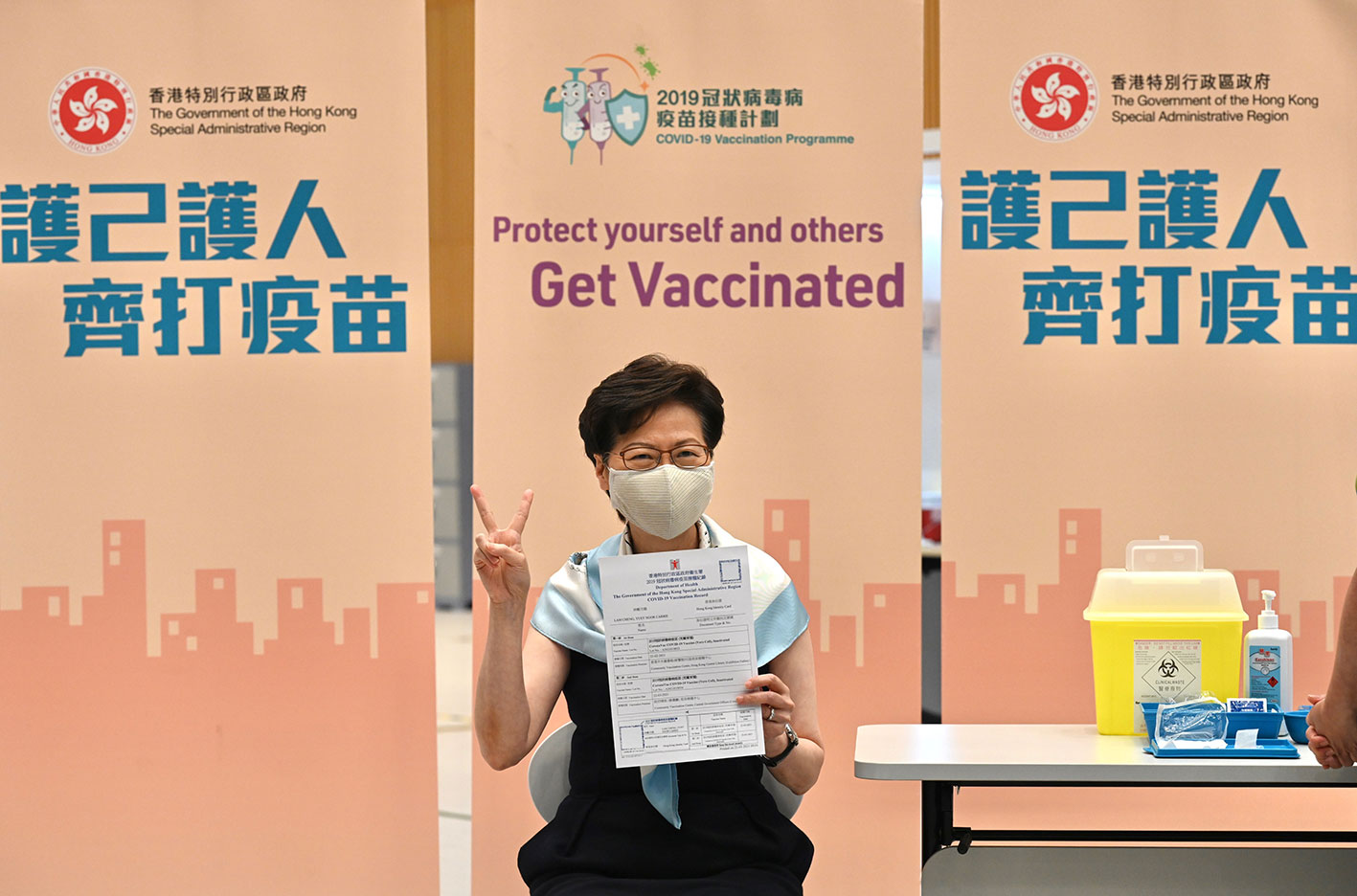 行政長官林鄭月娥今早(3月22日)率領多名司局長,在政府總部接種第二劑科興疫苗。