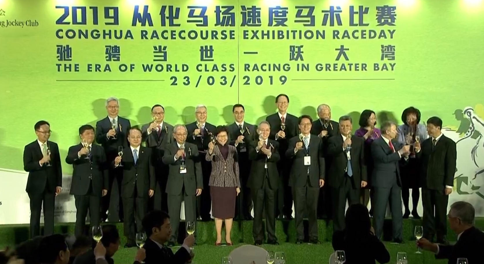 去年8月開幕的香港賽馬會廣東從化馬場,今日(3月23日)舉行了5場「純演示性速度馬術比賽」,出席的嘉賓包括兩地高官,包括特首林鄭月娥、港澳辦主任張曉明、廣東省省長馬興瑞、中聯辦主任王志民等。